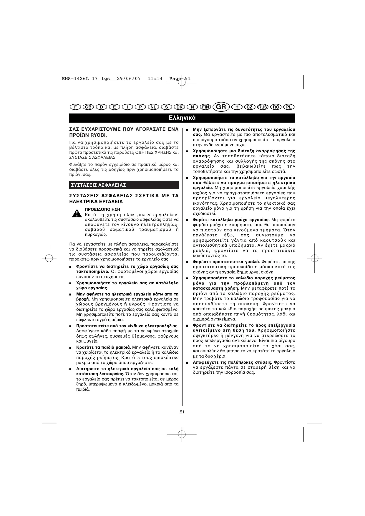 Συνδέστε το πρινι σας µε πρίζα 230 V συνδεδεµένη µε γείωση και προστατευµένη µε ασφάλεια τουλάχιστον 10 A. Μην εκθέτετε το ηλεκτρικ εργαλείο σας στη βροχή ή την υγρασία. Ελέγξτε πως το εργαλείο σας είναι σε καλή κατάσταση λειτουργίας πριν το χρησιµοποιήσετε. Μη χρησιµοποιείτε δίσκους απ ταχυχάλυβα. Μη χρησιµοποιείτε δίσκους τα χαρακτηριστικά των οποίων δεν αντιστοιχούν σε αυτά που ορίζονται στο παρν εγχειρίδιο. Βεβαιωθείτε πως τα κινούµενα τµήµατα του προφλακτήρα δίσκου περιστρέφονται ελεύθερα και λειτουργούν σωστά. Χρησιµοποιείτε αποκλειστικά ακονισµένους δίσκους και που δεν έχουν υποστεί ζηµιά καθώς και τα συνιστώµενα εξαρτήµατα. Στερεώστε γερά το προς επεξεργασία αντικείµενο πριν θέσετε το πρινι σε λειτουργία. Μην κρατάτε ποτέ το προς επεξεργασία αντικείµενο µε το χέρι σας. EMS-1426L_17 lgs