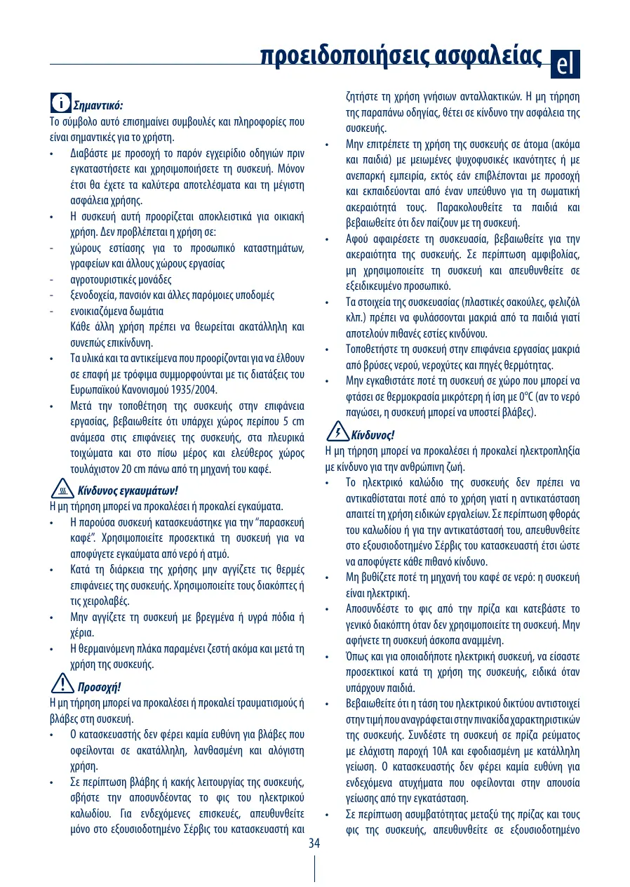 προειδοποιήσεις ασφαλείας el Σημαντικό: Το σύμβολο αυτό επισημαίνει συμβουλές και πληροφορίες που είναι σημαντικές για το χρήστη. • Διαβάστε με προσοχή το παρόν εγχειρίδιο οδηγιών πριν εγκαταστήσετε και χρησιμοποιήσετε τη συσκευή. Μόνον έτσι θα έχετε τα καλύτερα αποτελέσματα και τη μέγιστη ασφάλεια χρήσης. • Η συσκευή αυτή προορίζεται αποκλειστικά για οικιακή χρήση. Δεν προβλέπεται η χρήση σε: - χώρους εστίασης για το προσωπικό καταστημάτων, γραφείων και άλλους χώρους εργασίας - αγροτουριστικές μονάδες - ξενοδοχεία, πανσιόν και άλλες παρόμοιες υποδομές - ενοικιαζόμενα δωμάτια Κάθε άλλη χρήση πρέπει να θεωρείται ακατάλληλη και συνεπώς επικίνδυνη. • Τα υλικά και τα αντικείμενα που προορίζονται για να έλθουν σε επαφή με τρόφιμα συμμορφούνται με τις διατάξεις του Ευρωπαϊκού Κανονισμού 1935/2004. • Μετά την τοποθέτηση της συσκευής στην επιφάνεια εργασίας, βεβαιωθείτε ότι υπάρχει χώρος περίπου 5 cm ανάμεσα στις επιφάνειες της συσκευής, στα πλευρικά τοιχώματα και στο πίσω μέρος και ελεύθερος χώρος τουλάχιστον 20 cm πάνω από τη μηχανή του καφέ.