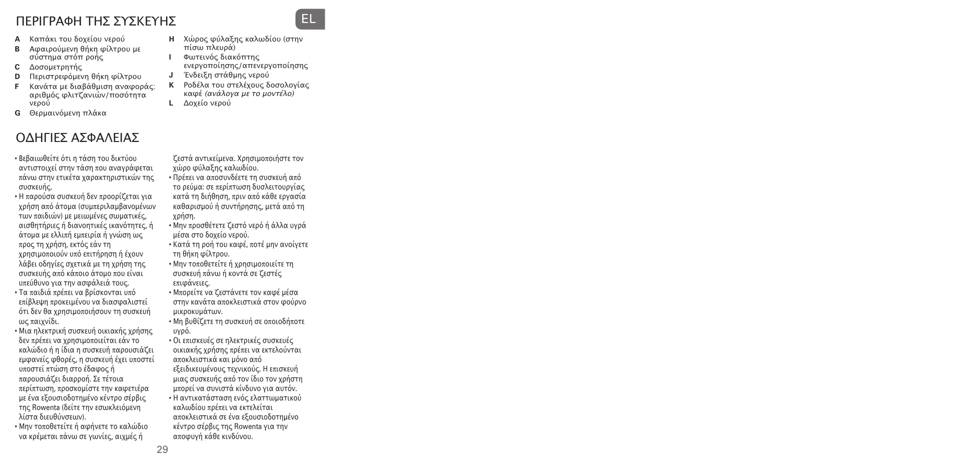 ΟΔΗΓΙΕΣ ΑΣΦΑΛΕΙΑΣ ζεστά αντικείμενα. Χρησιμοποιήστε τον χώρο φύλαξης καλωδίου. • Πρέπει να αποσυνδέετε τη συσκευή από το ρεύμα: σε περίπτωση δυσλειτουργίας κατά τη διήθηση, πριν από κάθε εργασία καθαρισμού ή συντήρησης, μετά από τη χρήση. • Μην προσθέτετε ζεστό νερό ή άλλα υγρά μέσα στο δοχείο νερού. • Κατά τη ροή του καφέ, ποτέ μην ανοίγετε τη θήκη φίλτρου. • Μην τοποθετείτε ή χρησιμοποιείτε τη συσκευή πάνω ή κοντά σε ζεστές επιφάνειες. • Μπορείτε να ζεστάνετε τον καφέ μέσα στην κανάτα αποκλειστικά στον φούρνο μικροκυμάτων. • Μη βυθίζετε τη συσκευή σε οποιοδήποτε υγρό. • Οι επισκευές σε ηλεκτρικές συσκευές οικιακής χρήσης πρέπει να εκτελούνται αποκλειστικά και μόνο από εξειδικευμένους τεχνικούς. Η επισκευή μιας συσκευής από τον ίδιο τον χρήστη μπορεί να συνιστά κίνδυνο για αυτόν. • Η αντικατάσταση ενός ελαττωματικού καλωδίου πρέπει να εκτελείται αποκλειστικά σε ένα εξουσιοδοτημένο κέντρο σέρβις της Rowenta για την αποφυγή κάθε κινδύνου.