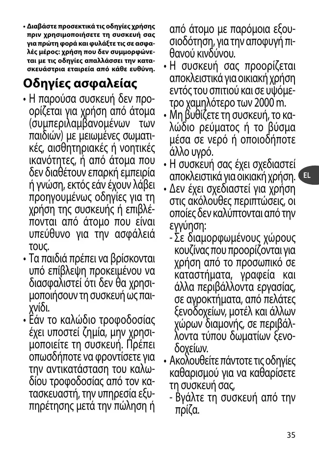 από άτομο με παρόμοια εξουσιοδότηση, για την αποφυγή πιθανού κινδύνου. • Η συσκευή σας προορίζεται αποκλειστικά για οικιακή χρήση εντός του σπιτιού και σε υψόμετρο χαμηλότερο των 2000 m. • Μη βυθίζετε τη συσκευή, το καλώδιο ρεύματος ή το βύσμα μέσα σε νερό ή οποιοδήποτε άλλο υγρό. • Η συσκευή σας έχει σχεδιαστεί αποκλειστικά για οικιακή χρήση. • Δεν έχει σχεδιαστεί για χρήση στις ακόλουθες περιπτώσεις, οι οποίες δεν καλύπτονται από την εγγύηση: - Σε διαμορφωμένους χώρους κουζίνας που προορίζονται για χρήση από το προσωπικό σε καταστήματα, γραφεία και άλλα περιβάλλοντα εργασίας, σε αγροκτήματα, από πελάτες ξενοδοχείων, μοτέλ και άλλων χώρων διαμονής, σε περιβάλλοντα τύπου δωματίων ξενοδοχείων. • Ακολουθείτε πάντοτε τις οδηγίες καθαρισμού για να καθαρίσετε τη συσκευή σας, - Βγάλτε τη συσκευή από την πρίζα. 35