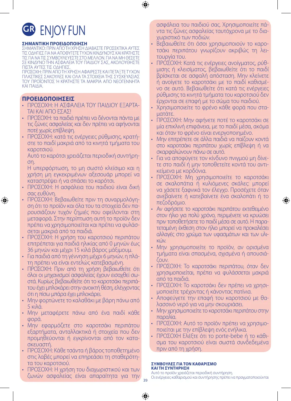 ασφάλεια του παιδιού σας. Χρησιμοποιείτε πάντα τις ζώνες ασφαλείας ταυτόχρονα με το διαχωριστικό των ποδιών. Βεβαιωθείτε ότι όσοι χρησιμοποιούν το καροτσάκι περιπάτου γνωρίζουν ακριβώς τη λειτουργία του. ΠΡΟΣΟΧΗ: Κατά τις ενέργειες ανοίγματος, ρύθμισης ή κλεισίματος, βεβαιωθείτε ότι το παιδί βρίσκεται σε ασφαλή απόσταση. Μην κλείνετε ή ανοίγετε το καροτσάκι με το παιδί καθισμένο σε αυτό. Βεβαιωθείτε ότι κατά τις ενέργειες ρύθμισης τα κινητά τμήματα του καροτσιού δεν έρχονται σε επαφή με το σώμα του παιδιού. Χρησιμοποιείτε το φρένο κάθε φορά που σταματάτε. ΠΡΟΣΟΧΗ: Μην αφήνετε ποτέ το καροτσάκι σε μία επικλινή επιφάνεια, με το παιδί μέσα, ακόμα και όταν το φρένο είναι ενεργοποιημένο. Μην επιτρέπετε σε άλλα παιδιά να παίζουν κοντά στο καροτσάκι περιπάτου χωρίς επίβλεψη ή να σκαρφαλώνουν πάνω σε αυτό. Για να αποφύγετε τον κίνδυνο πνιγμού μη δίνετε στο παιδί ή μην τοποθετείτε κοντά του αντικείμενα με κορδόνια. ΠΡΟΣΟΧΗ: Μη χρησιμοποιείτε το καροτσάκι σε σκαλοπάτια ή κυλιόμενες σκάλες: μπορεί να χάσετε ξαφνικά τον έλεγχο. Προσέχετε όταν ανεβαίνετε ή κατεβαίνετε ένα σκαλοπάτι ή το πεζοδρόμιο. Αν αφήσετε το καροτσάκι περιπάτου εκτεθειμένο στον ήλιο για πολύ χρόνο, περιμένετε να κρυώσει πριν τοποθετήσετε το παιδί μέσα σε αυτό. Η παρατεταμένη έκθεση στον ήλιο μπορεί να προκαλέσει αλλαγές στο χρώμα των υφασμάτων και των υλικών. Μην χρησιμοποιείτε το προϊόν, αν ορισμένα τμήματα είναι σπασμένα, σχισμένα ή απουσιάζουν. ΠΡΟΣΟΧΗ: Το καροτσάκι περιπάτου, όταν δεν χρησιμοποιείται, πρέπει να φυλάσσεται μακριά από τα παιδιά. ΠΡΟΣΟΧΗ: Το καροτσάκι δεν πρέπει να χρησιμοποιείτε τρέχοντας ή κάνοντας πατίνια. Αποφεύγετε την επαφή του καροτσιού με θαλασσινό νερό για να μην σκουριάσει. Μην χρησιμοποιείτε το καροτσάκι περιπάτου στην ΠΡΟΣΟΧΗ: Αυτό το προϊόν πρέπει να χρησιμοποιείται με την επίβλεψη ενός ενήλικα. ΠΡΟΣΟΧΗ Ελέξτε ότι το porte-bebe ή το κάθισμα του καροτσιού είναι σωστά συνδεδεμένα πριν από τη χρήση. ΣΥΜΒΟΥΛΕΣ ΓΙΑ ΤΟΝ ΚΑΘΑΡΙΣΜΟ ΚΑΙ ΤΗ ΣΥΝΤΗΡΗΣΗ Αυτό το προϊόν χρειάζεται περιοδική συντήρηση. Οι ενέργειες καθαρισμού και συντήρησης πρέπει να πραγματοποιούνται μόνο από έναν ενήλικα.