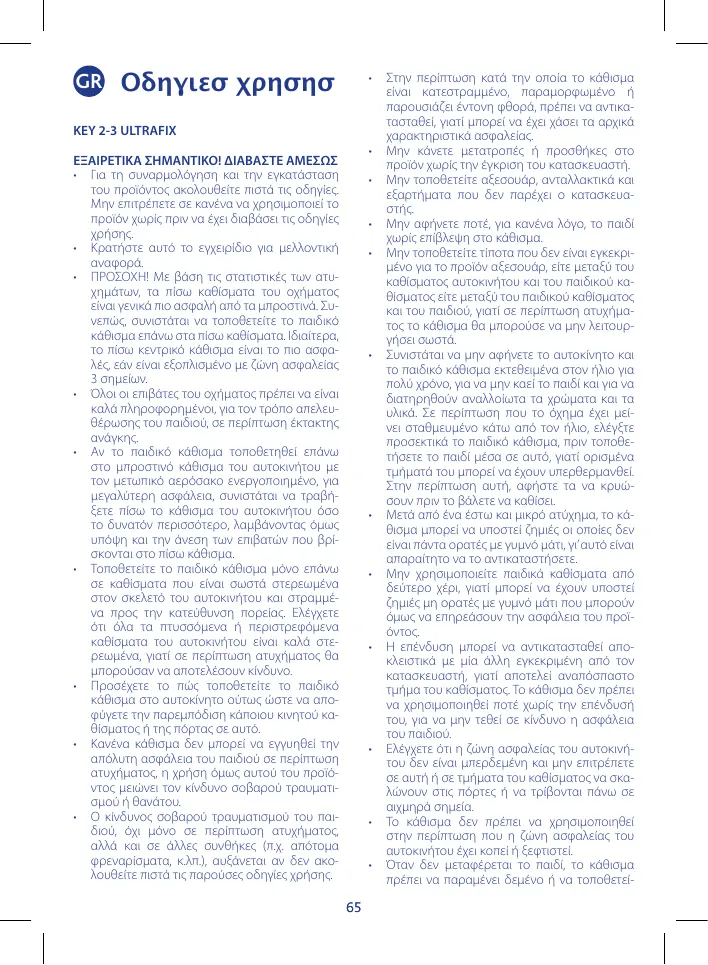 - Ο κίνδυνος σοβαρού τραυματισμού του παιδιού, όχι μόνο σε περίπτωση ατυχήματος, αλλά και σε άλλες συνθήκες (π.χ. απότομα φρεναρίσματα, κ.λπ.), αυξάνεται αν δεν ακολουθείτε πιστά τις παρούσες οδηγίες χρήσης.