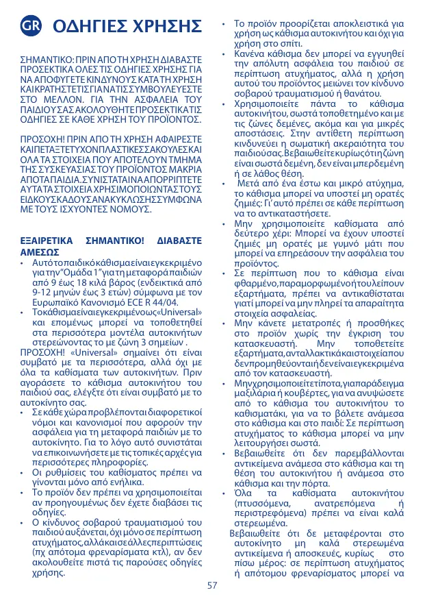 • No permita que nadie utilice el producto sin haber leído las instrucciones. • Si no se siguen exactamente las instrucciones de este manual aumenta el riesgo de daños graves para el niño, no sólo en caso de accidente sino también en otras situaciones (por ej. frenadas bruscas, etc.). • Este producto debe ser utilizado exclusivamente como sillita de automóvil; no utili28
