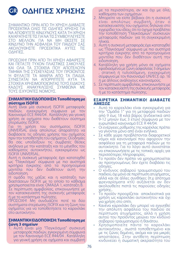 ÉVITER TOUT RISQUE PENDANT L’UTILISATION, CONSERVER LA NOTICE D’INSTRUCTIONS POUR POUVOIR VOUS Y REFERER ULTERIEUREMENT. SUIVRE ATTENTIVEMENT CES INSTRUCTIONS POUR NE PAS COMPROMETTRE LA SECURITE DE VOTRE ENFANT. ATTENTION ! AVANT L’UTILISATION, ENLEVER ET JETER TOUS LES SACHETS EN PLASTIQUE EVENTUELS ET TOUS LES ELEMENTS COMPOSANT L’EMBALLAGE DU PRODUIT. LES TENIR HORS DE PORTEE DES ENFANTS. NOUS RECOMMANDONS DE JETER CES ELEMENTS CONFORMEMENT AUX REGLEMENTATIONS EN VIGUEUR. AVIS IMPORTANT : Installation avec système ISOFIX 1. Il s’agit d’un dispositif ISOFIX de retenue pour enfants approuvé par le Règlement ECE R44/04 pour l’emploi général dans les véhicules munis de systèmes d’ancrage ISOFIX. 2. Pour l’utilisation d’un système ISOFIX UNIVERSEL il est impératif lire le manuel du véhicule avant d’installer le siège-auto. Le manuel indiquera les places compatibles avec la classe du siège-auto, homologué ISOFIX UNIVERSEL. 3. Ce dispositif de retenue a été classé “Universel” selon des critères d’homologation plus sévères que ceux de modèles non ISOFIX. 4. Le groupe de masse et la classe de l’ISOFIX pour lequel le dispositif est utilisable sont : GROUPE 1, CLASSE B. 5. En cas de doute, contacter le fabricant du siège-auto ou le revendeur. ATTENTION ! Ne jamais combiner les deux systèmes d’accrochage ISOFIX et la ceinture du véhicule pour installer le siège-auto. ATTENTION ! Pendant l’utilisation de l’ISOFIX, il ne suffit pas de fixer les ancrages inférieurs. Il faut absolument fixer l’“attache supérieure” au point d’ancrage prévu par le constructeur du véhicule.