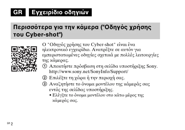 Εγχειρίδιο οδηγιών Περισστερα για την κάμερα ("Οδηγς χρήσης του Cyber-shot") Ο "Οδηγς χρήσης του Cyber-shot" είναι ένα ηλεκτρονικ εγχειρίδιο. Ανατρέξτε σε αυτν για εμπεριστατωμένες οδηγίες σχετικά με πολλές λειτουργίες της κάμερας. 1 Αποκτήστε πρσβαση στη σελίδα υποστήριξης Sony. http://www.sony.net/SonyInfo/Support/ 2 Επιλέξτε τη χώρα ή την περιοχή σας. 3 Αναζητήστε το νομα μοντέλου της κάμεράς σας εντς της σελίδας υποστήριξης.