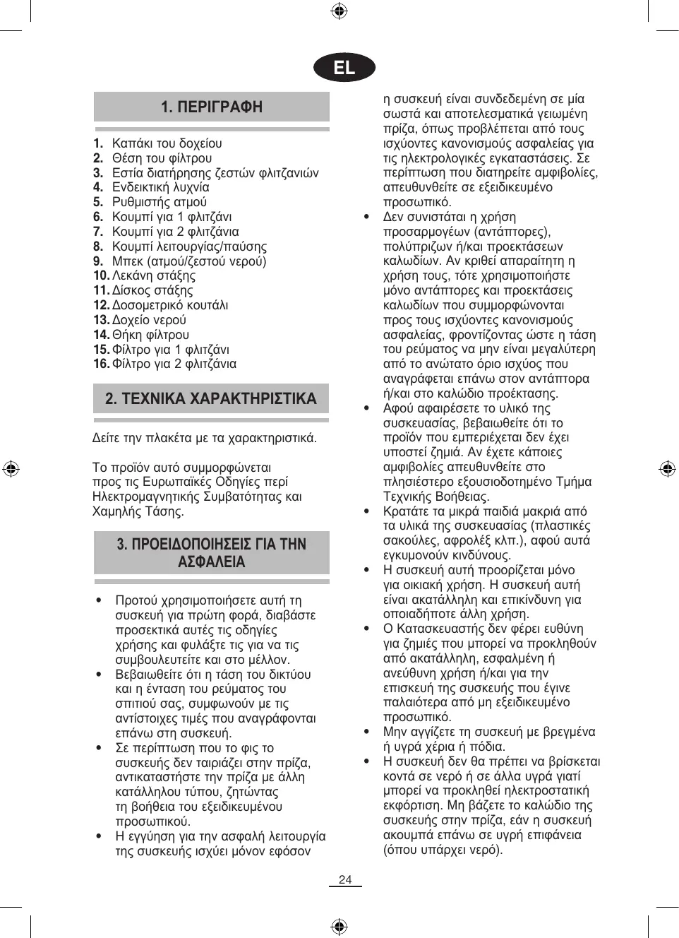 Μην αφήνετε την συσκευή εκτεθειμένη σε εξωτερικούς περιβαλλοντικούς παράγοντες (βροχή, ήλιος, πάγος Μην χρησιμοποιείτε και μην τοποθετείτε κανένα μέρος της συσκευής αυτής επάνω ή κοντά σε πηγές θερμότητας (μάτια ηλεκτρικής κουζίνας, κουζίνας γκαζιού ή Μην χρησιμοποιείτε απορρυπαντικά ή διαλυτικά χημικά προϊόντα για τον καθαρισμό της συσκευής. Μην ακουμπάτε τις θερμαινόμενες επιφάνειες της συσκευής. Χρησιμοποιείτε τις ειδικές λαβές ή Μην αφήνετε το καλώδιο να έρχεται σε επαφή με τις θερμαινόμενες επιφάνειες της συσκευής. Μη θέτετε τη συσκευή σε λειτουργία χωρίς νερό στο δοχείο. Μη θερμαίνετε εύφλεκτα υγρά με τον Η λεκάνη στάξης και ο δίσκος πρέπει να είναι σωστά τοποθετημένα πριν θέσετε σε λειτουργία την καφετιέρα. Προσοχή! Το μπεκ ατμού και η θήκη φίλτρου θερμαίνονται κατά τη διάρκεια λειτουργίας της καφετιέρας και, συνεπώς, υπάρχει κίνδυνος εγκαυμάτων. Κατά τη διάρκεια λειτουργίας, η καφετιέρα λειτουργεί υπό πίεση και υπάρχει κίνδυνος εγκαυμάτων. Κατά την παρασκευή καφέ, η θήκη φίλτρου πρέπει να είναι σωστά τοποθετημένη. Μην αφαιρείτε τη θήκη φίλτρου όταν η συσκευή είναι σε λειτουργία. Κατά τη διάρκεια λειτουργίας της συσκευής, το νερό στο δοχείο πρέπει να είναι πάντα πάνω από την ένδειξη MIN.