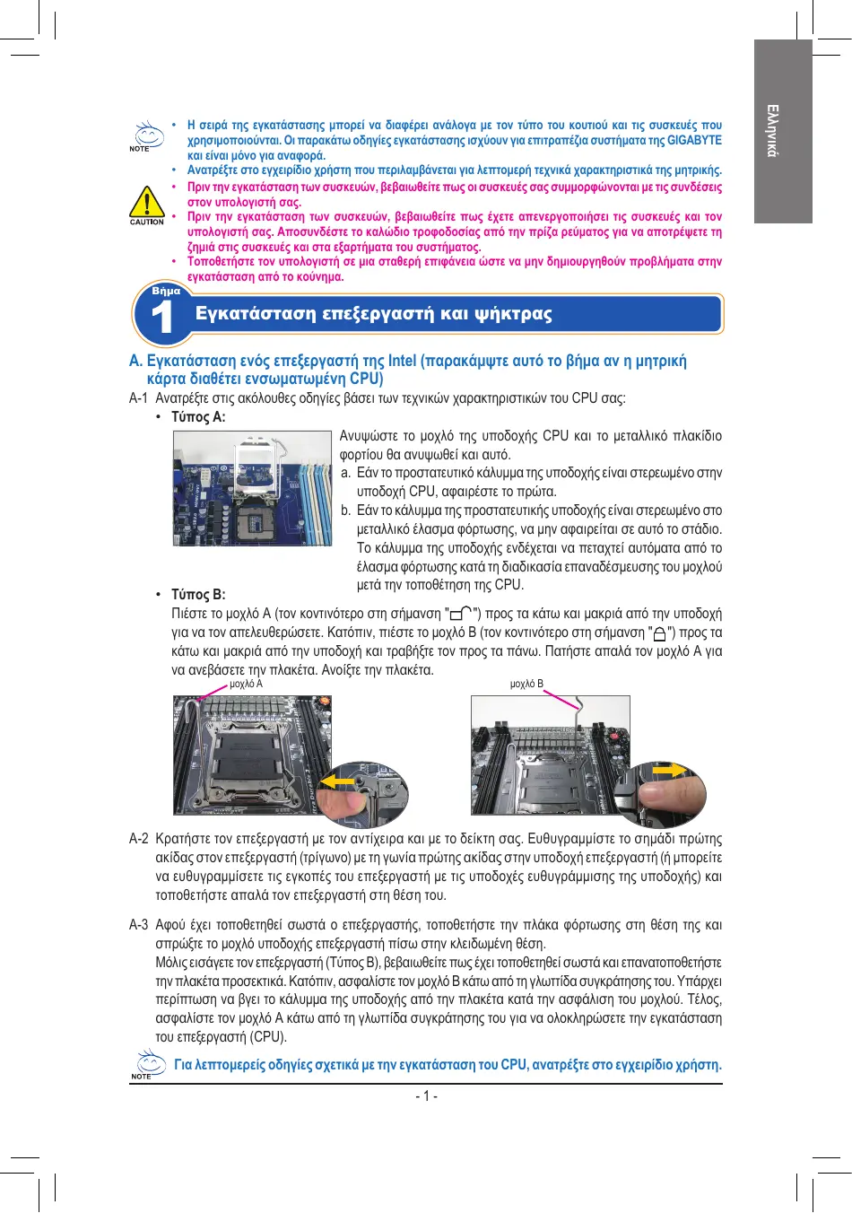 - • Τύπος B: Πιέστε το μοχλό Α (τον κοντινότερο στη σήμανση " ") προς τα κάτω και μακριά από την υποδοχή για να τον απελευθερώσετε. Κατόπιν, πιέστε το μοχλό Β (τον κοντινότερο στη σήμανση " ") προς τα κάτω και μακριά από την υποδοχή και τραβήξτε τον προς τα πάνω. Πατήστε απαλά τον μοχλό Α για να ανεβάσετε την πλακέτα. Ανοίξτε την πλακέτα. μοχλό A μοχλό B A-2 Κρατήστε τον επεξεργαστή με τον αντίχειρα και με το δείκτη σας. Ευθυγραμμίστε το σημάδι πρώτης ακίδας στον επεξεργαστή (τρίγωνο) με τη γωνία πρώτης ακίδας στην υποδοχή επεξεργαστή (ή μπορείτε να ευθυγραμμίσετε τις εγκοπές του επεξεργαστή με τις υποδοχές ευθυγράμμισης της υποδοχής) και τοποθετήστε απαλά τον επεξεργαστή στη θέση του. A-3 Αφού έχει τοποθετηθεί σωστά ο επεξεργαστής, τοποθετήστε την πλάκα φόρτωσης στη θέση της και σπρώξτε το μοχλό υποδοχής επεξεργαστή πίσω στην κλειδωμένη θέση. Μόλις εισάγετε τον επεξεργαστή (Τύπος B), βεβαιωθείτε πως έχει τοποθετηθεί σωστά και επανατοποθετήστε την πλακέτα προσεκτικά. Κατόπιν, ασφαλίστε τον μοχλό Β κάτω από τη γλωττίδα συγκράτησης του. Υπάρχει περίπτωση να βγει το κάλυμμα της υποδοχής από την πλακέτα κατά την ασφάλιση του μοχλού. Τέλος, ασφαλίστε τον μοχλό Α κάτω από τη γλωττίδα συγκράτησης του για να ολοκληρώσετε την εγκατάσταση του επεξεργαστή (CPU). Για λεπτομερείς οδηγίες σχετικά με την εγκατάσταση του CPU, ανατρέξτε στο εγχειρίδιο χρήστη.
