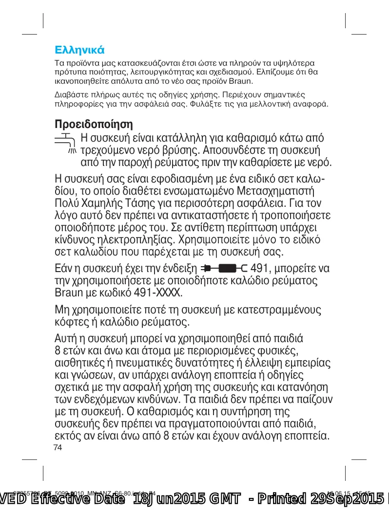 Τα προϊόντα μας κατασκευάζονται έτσι ώστε να πληρούν τα υψηλότερα πρότυπα ποιότητας, λειτουργικότητας και σχεδιασμού. Ελπίζουμε ότι θα ικανοποιηθείτε απόλυτα από το νέο σας προϊόν Braun. Διαβάστε πλήρως αυτές τις οδηγίες χρήσης. Περιέχουν σημαντικές πληροφορίες για την ασφάλειά σας. Φυλάξτε τις για μελλοντική αναφορά. Προειδοποίηση Η συσκευή είναι κατάλληλη για καθαρισμό κάτω από τρεχούμενο νερό βρύσης. Αποσυνδέστε τη συσκευή από την παροχή ρεύματος πριν την καθαρίσετε με νερό. Η συσκευή σας είναι εφοδιασμένη με ένα ειδικό σετ καλωδίου, το οποίο διαθέτει ενσωματωμένο Μετασχηματιστή Πολύ Χαμηλής Τάσης για περισσότερη ασφάλεια. Για τον λόγο αυτό δεν πρέπει να αντικαταστήσετε ή τροποποιήσετε οποιοδήποτε μέρος του. Σε αντίθετη περίπτωση υπάρχει κίνδυνος ηλεκτροπληξίας. Χρησιμοποιείτε μόνο το ειδικό σετ καλωδίου που παρέχεται με τη συσκευή σας. 491, μπορείτε να Εάν η συσκευή έχει την ένδειξη την χρησιμοποιήσετε με οποιοδήποτε καλώδιο ρεύματος Braun με κωδικό 491-ΧΧΧΧ. Μη χρησιμοποιείτε ποτέ τη συσκευή με κατεστραμμένους κόφτες ή καλώδιο ρεύματος. Αυτή η συσκευή μπορεί να χρησιμοποιηθεί από παιδιά 8 ετών και άνω και άτομα με περιορισμένες φυσικές, αισθητικές ή πνευματικές δυνατότητες ή έλλειψη εμπειρίας και γνώσεων, αν υπάρχει ανάλογη εποπτεία ή οδηγίες σχετικά με την ασφαλή χρήση της συσκευής και κατανόηση των ενδεχόμενων κινδύνων. Τα παιδιά δεν πρέπει να παίζουν με τη συσκευή. Ο καθαρισμός και η συντήρηση της συσκευής δεν πρέπει να πραγματοποιούνται από παιδιά, εκτός αν είναι άνω από 8 ετών και έχουν ανάλογη εποπτεία.