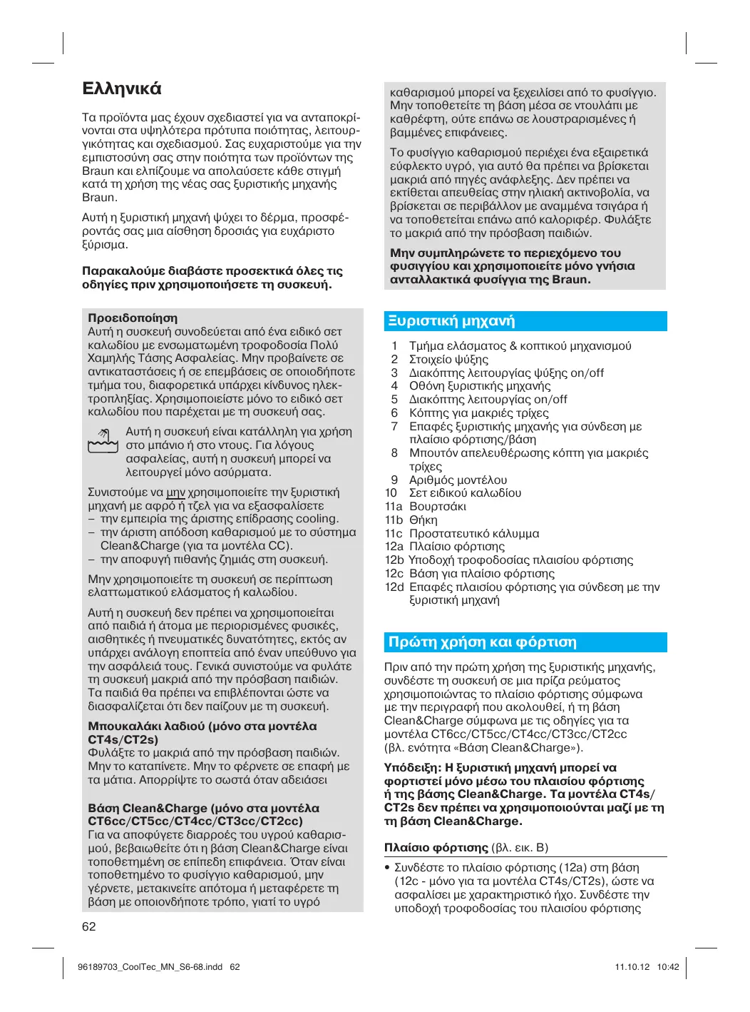 Τα προϊόντα μας έχουν σχεδιαστεί για να ανταποκρίνονται στα υψηλότερα πρότυπα ποιότητας, λειτουργικότητας και σχεδιασμού. Σας ευχαριστούμε για την εμπιστοσύνη σας στην ποιότητα των προϊόντων της Braun και ελπίζουμε να απολαύσετε κάθε στιγμή κατά τη χρήση της νέας σας ξυριστικής μηχανής Braun. Αυτή η ξυριστική μηχανή ψύχει το δέρμα, προσφέροντάς σας μια αίσθηση δροσιάς για ευχάριστο Παρακαλούμε διαβάστε προσεκτικά όλες τις οδηγίες πριν χρησιμοποιήσετε τη συσκευή. Προειδοποίηση Αυτή η συσκευή συνοδεύεται από ένα ειδικό σετ καλωδίου με ενσωματωμένη τροφοδοσία Πολύ Χαμηλής Τάσης Ασφαλείας. Μην προβαίνετε σε αντικαταστάσεις ή σε επεμβάσεις σε οποιοδήποτε τμήμα του, διαφορετικά υπάρχει κίνδυνος ηλεκτροπληξίας. Χρησιμοποιείστε μόνο το ειδικό σετ καλωδίου που παρέχεται με τη συσκευή σας. Αυτή η συσκευή είναι κατάλληλη για χρήση στο μπάνιο ή στο ντους. Για λόγους ασφαλείας, αυτή η συσκευή μπορεί να λειτουργεί μόνο ασύρματα. Συνιστούμε να μην χρησιμοποιείτε την ξυριστική μηχανή με αφρό ή τζελ για να εξασφαλίσετε – την εμπειρία της άριστης επίδρασης cooling. – την άριστη απόδοση καθαρισμού με το σύστημα Clean&Charge (για τα μοντέλα CC). – την αποφυγή πιθανής ζημιάς στη συσκευή. Μην χρησιμοποιείτε τη συσκευή σε περίπτωση ελαττωματικού ελάσματος ή καλωδίου. Αυτή η συσκευή δεν πρέπει να χρησιμοποιείται από παιδιά ή άτομα με περιορισμένες φυσικές, αισθητικές ή πνευματικές δυνατότητες, εκτός αν υπάρχει ανάλογη εποπτεία από έναν υπεύθυνο για την ασφάλειά τους. Γενικά συνιστούμε να φυλάτε τη συσκευή μακριά από την πρόσβαση παιδιών. Τα παιδιά θα πρέπει να επιβλέπονται ώστε να διασφαλίζεται ότι δεν παίζουν με τη συσκευή. Μπουκαλάκι λαδιού (μόνο στα μοντέλα CT4s/CT2s) Φυλάξτε το μακριά από την πρόσβαση παιδιών. Μην το καταπίνετε. Μην το φέρνετε σε επαφή με τα μάτια. Απορρίψτε το σωστά όταν αδειάσει Βάση Clean&Charge (μόνο στα μοντέλα CT6cc/CT5cc/CT4cc/CT3cc/CT2cc) Για να αποφύγετε διαρροές του υγρού καθαρισμού, βεβαιωθείτε ότι η βάση Clean&Charge είναι τοποθετημένη σε επίπεδη επιφάνεια. Όταν είναι τοποθετημένο το φυσίγγιο καθαρισμού, μην γέρνετε, μετακινείτε απότομα ή μεταφέρετε τη βάση με οποιονδήποτε τρόπο, γιατί το υγρό καθαρισμού μπορεί να ξεχειλίσει από το φυσίγγιο. Μην τοποθετείτε τη βάση μέσα σε ντουλάπι με καθρέφτη, ούτε επάνω σε λουστραρισμένες ή βαμμένες επιφάνειες. Το φυσίγγιο καθαρισμού περιέχει ένα εξαιρετικά εύφλεκτο υγρό, για αυτό θα πρέπει να βρίσκεται μακριά από πηγές ανάφλεξης. Δεν πρέπει να εκτίθεται απευθείας στην ηλιακή ακτινοβολία, να βρίσκεται σε περιβάλλον με αναμμένα τσιγάρα ή να τοποθετείται επάνω από καλοριφέρ. Φυλάξτε το μακριά από την πρόσβαση παιδιών. Μην συμπληρώνετε το περιεχόμενο του φυσιγγίου και χρησιμοποιείτε μόνο γνήσια ανταλλακτικά φυσίγγια της Braun. Ξυριστική μηχανή