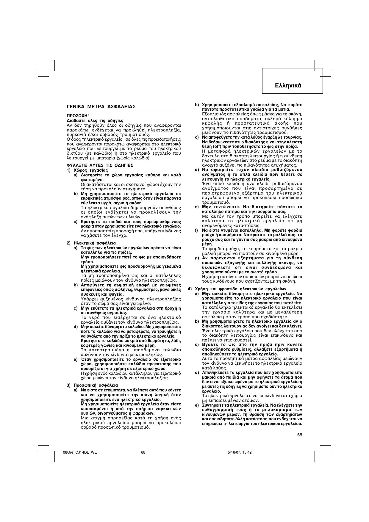 5/16/07, 15:42 ∂ÏÏËÓÈο ™Â ÂÚ›ÙˆÛË ‚Ï¿‚˘, ÙÔ ËÏÂÎÙÚÈÎfi ÂÚÁ·ÏÂ›Ô Ú¤ÂÈ Ó· ÂÈÛ΢·ÛÙ› ÚÈÓ ¯ÚËÛÈÌÔÔÈËı›. Πολλά ατυχήµατα προκαλούνται απ ηλεκτρικά εργαλεία που δεν έχουν συντηρηθεί σωστά. f) ¢È·ÙËÚ›Ù ٷ ÂÚÁ·Ï›· ÎÔ‹˜ ÎÔÊÙÂÚ¿ Î·È Î·ı·Ú¿. Τα κατάλληλα συντηρηµένα εργαλεία κοπής µε κοφτερές γωνίες µπλοκάρουν πιο δύσκολα και ελέγχονται πιο εύκολα. g) ÃÚËÛÈÌÔÔț٠ÙÔ ËÏÂÎÙÚÈÎfi ÂÚÁ·Ï›Ô, Ù· ÂÍ·ÚÙ‹Ì·Ù·, ÙȘ ̇Ù˜ ÙˆÓ ÂÚÁ·Ï›ˆÓ ÎÏ.,Û‡Ìʈӷ Ì ·˘Ù¤˜ ÙȘ Ô‰ËÁ›Â˜ Î·È Ì ÙÚfiÔ Ô˘ Â›Ó·È Î·Ù¿ÏÏËÏÔ˜ ÁÈ· ÙÔÓ Û˘ÁÎÂÎÚÈ̤ÓÔ Ù‡Ô ËÏÂÎÙÚÈÎÔ‡ ÂÚÁ·Ï›Ԣ, Ï·Ì‚¿ÓÔÓÙ·˜ ˘fi„Ë ÙȘ Û˘Óı‹Î˜ ÂÚÁ·Û›·˜ Î·È ÙËÓ ÂÚÁ·Û›· Ô˘ ÚfiÎÂÈÙ·È Ó· ÂÎÙÂÏÂÛÙ›. Η χρήση του ηλεκτρικού εργαλείου σε λειτουργίες διαφορετικές απ εκείνες για τις οποίες προορίζεται µπορεί να δηµιουργήσει επικίνδυνες καταστάσεις.
