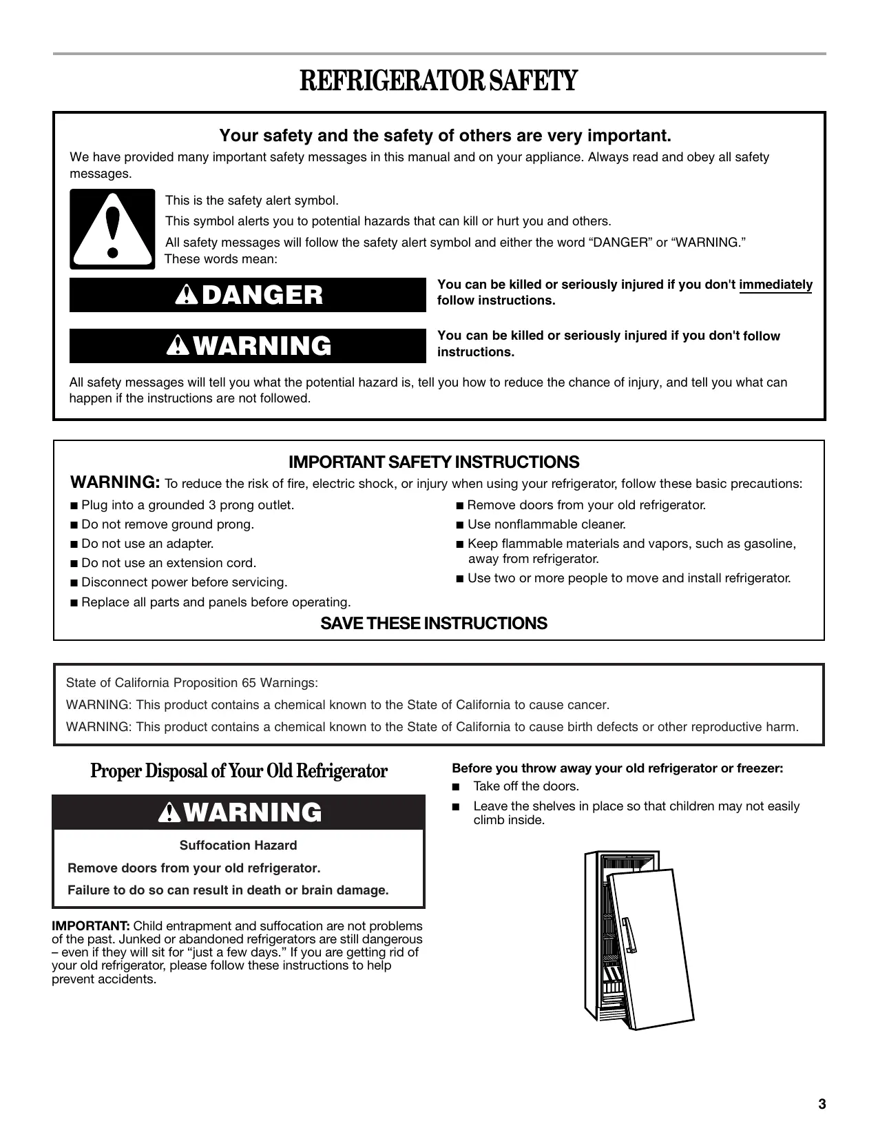 WARNING: This product contains a chemical known to the State of California to cause birth defects or other reproductive harm. Proper Disposal of Your Old Refrigerator WARNING Before you throw away your old refrigerator or freezer: ■ Take off the doors.
