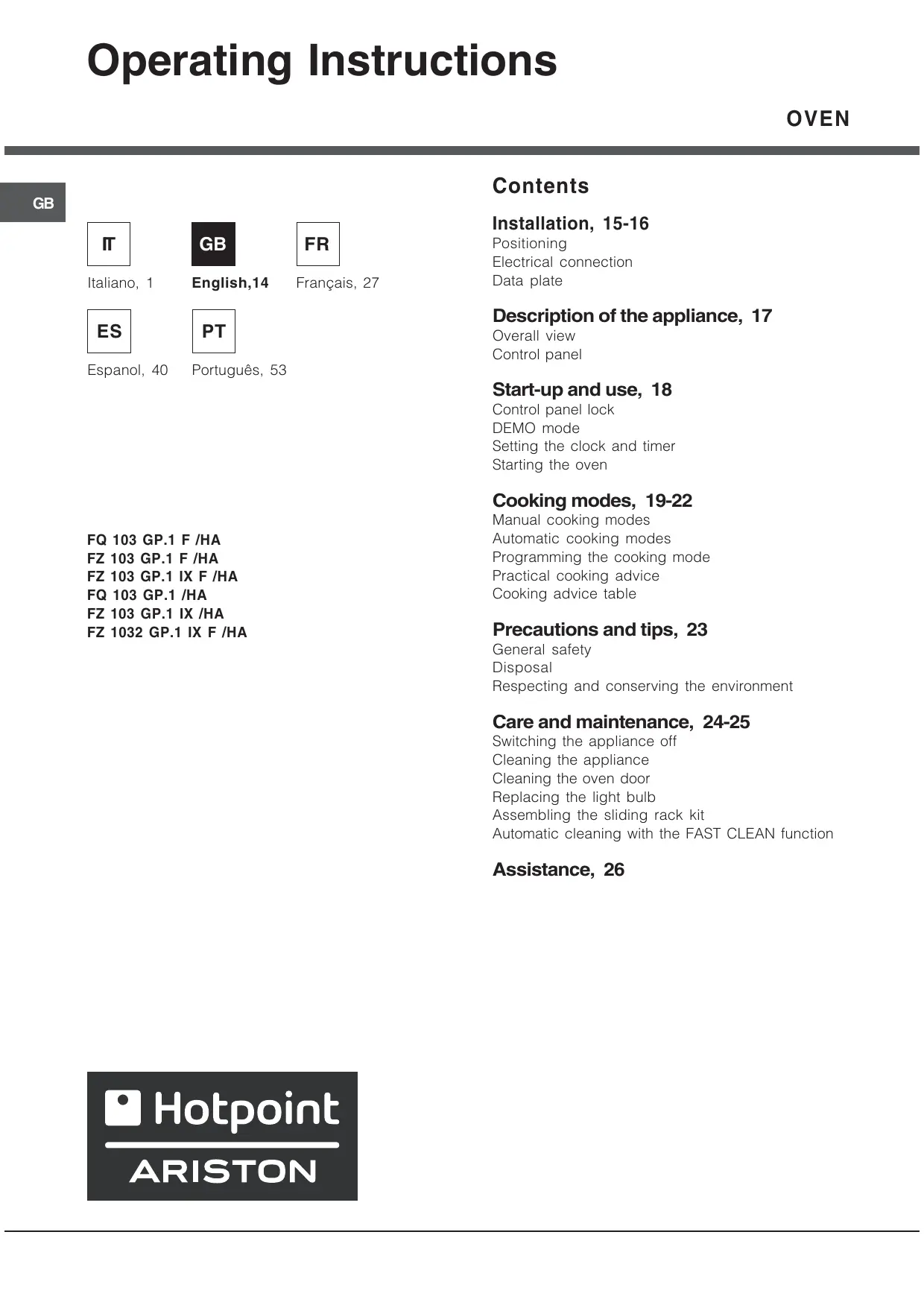 USER MANUAL FZ 103 GP.1 IX F /HA HOTPOINT-ARISTON