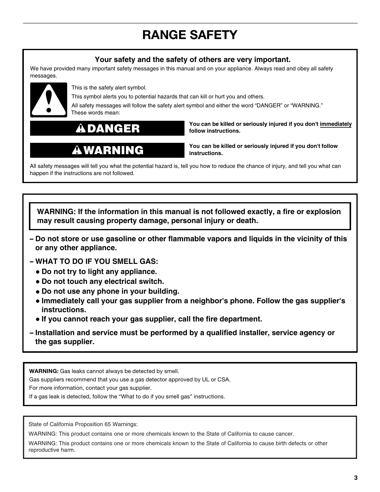 RANGE SAFETY Your safety and the safety of others are very important. We have provided many important safety messages in this manual and on your appliance. Always read and obey all safety messages. This is the safety alert symbol. This symbol alerts you to potential hazards that can kill or hurt you and others. All safety messages will follow the safety alert symbol and either the word “DANGER” or “WARNING.” These words mean: DANGER WARNING You can be killed or seriously injured if you don't immediately follow instructions. You can be killed or seriously injured if you don't follow instructions. All safety messages will tell you what the potential hazard is, tell you how to reduce the chance of injury, and tell you what can happen if the instructions are not followed.
