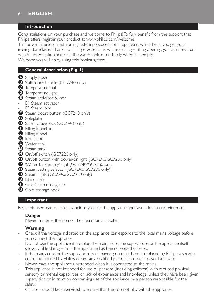 Supply hose Soft-touch handle (GC7240 only) Temperature dial Temperature light Steam activator & lock E1 Steam activator E2 Steam lock Steam boost button (GC7240 only) Soleplate Safe storage lock (GC7240 only) Filling funnel lid Filling funnel Iron stand Water tank Steam tank On/off switch (GC7220 only) On/off button with power-on light (GC7240/GC7230 only) ‘Water tank empty’ light (GC7240/GC7230 only) Steam setting selector (GC7240/GC7230 only) Steam lights (GC7240/GC7230 only) Mains cord Calc-Clean rinsing cap Cord storage hook Important Read this user manual carefully before you use the appliance and save it for future reference.