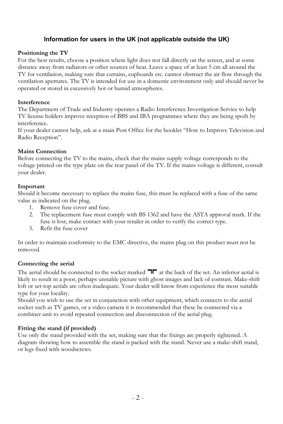 In order to maintain conformity to the EMC directive, the mains plug on this product must not be removed. Connecting the aerial at the back of the set. An inferior aerial is The aerial should be connected to the socket marked likely to result in a poor, perhaps unstable picture with ghost images and lack of contrast. Make-shift loft or set-top aerials are often inadequate. Your dealer will know from experience the most suitable type for your locality. Should you wish to use the set in conjunction with other equipment, which connects to the aerial socket such as TV games, or a video camera it is recommended that these be connected via a combiner unit to avoid repeated connection and disconnection of the aerial plug. Fitting the stand (if provided) Use only the stand provided with the set, making sure that the fixings are properly tightened. A diagram showing how to assemble the stand is packed with the stand. Never use a make-shift stand, or legs fixed with woodscrews.