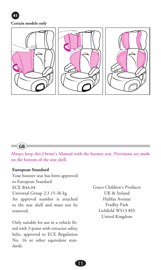 GB Always keep this Owner’s Manual with the booster seat. Provisions are made on the bottom of the seat shell.