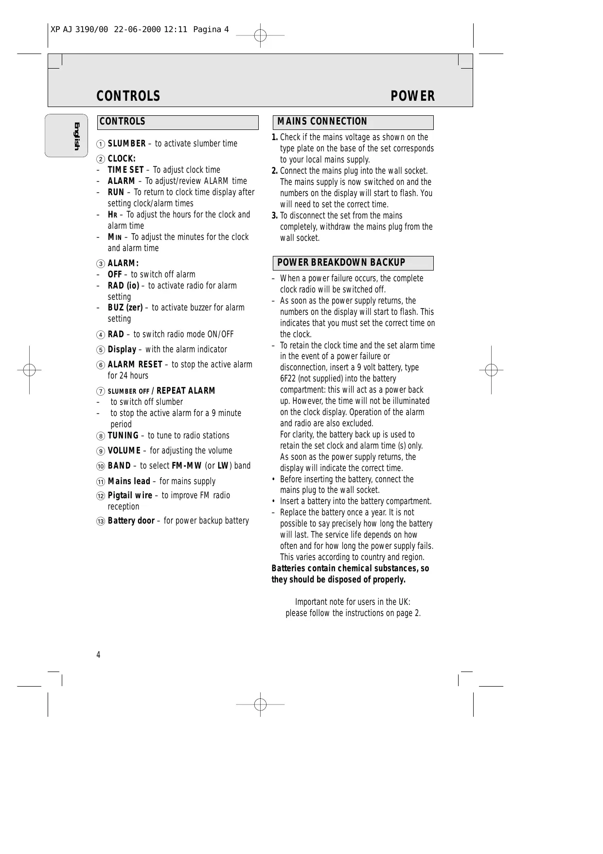 – When a power failure occurs, the complete clock radio will be switched off. – As soon as the power supply returns, the numbers on the display will start to flash. This indicates that you must set the correct time on the clock. – To retain the clock time and the set alarm time in the event of a power failure or disconnection, insert a 9 volt battery, type 6F22 (not supplied) into the battery compartment: this will act as a power back up. However, the time will not be illuminated on the clock display. Operation of the alarm and radio are also excluded. For clarity, the battery back up is used to retain the set clock and alarm time (s) only. As soon as the power supply returns, the display will indicate the correct time. • Before inserting the battery, connect the mains plug to the wall socket. • Insert a battery into the battery compartment. – Replace the battery once a year. It is not possible to say precisely how long the battery will last. The service life depends on how often and for how long the power supply fails. This varies according to country and region. Batteries contain chemical substances, so they should be disposed of properly. Important note for users in the UK: please follow the instructions on page 2.