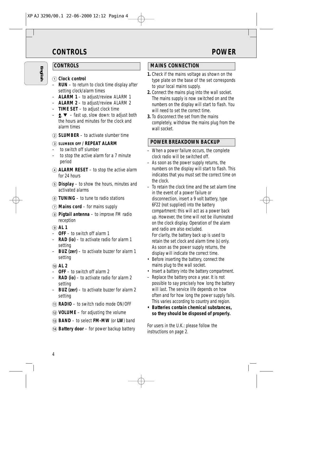 – When a power failure occurs, the complete clock radio will be switched off. – As soon as the power supply returns, the numbers on the display will start to flash. This indicates that you must set the correct time on the clock. – To retain the clock time and the set alarm time in the event of a power failure or disconnection, insert a 9 volt battery, type 6F22 (not supplied) into the battery compartment: this will act as a power back up. However, the time will not be illuminated on the clock display. Operation of the alarm and radio are also excluded. For clarity, the battery back up is used to retain the set clock and alarm time (s) only. As soon as the power supply returns, the display will indicate the correct time. • Before inserting the battery, connect the mains plug to the wall socket. • Insert a battery into the battery compartment. – Replace the battery once a year. It is not possible to say precisely how long the battery will last. The service life depends on how often and for how long the power supply fails. This varies according to country and region. • Batteries contain chemical substances, so they should be disposed of properly.