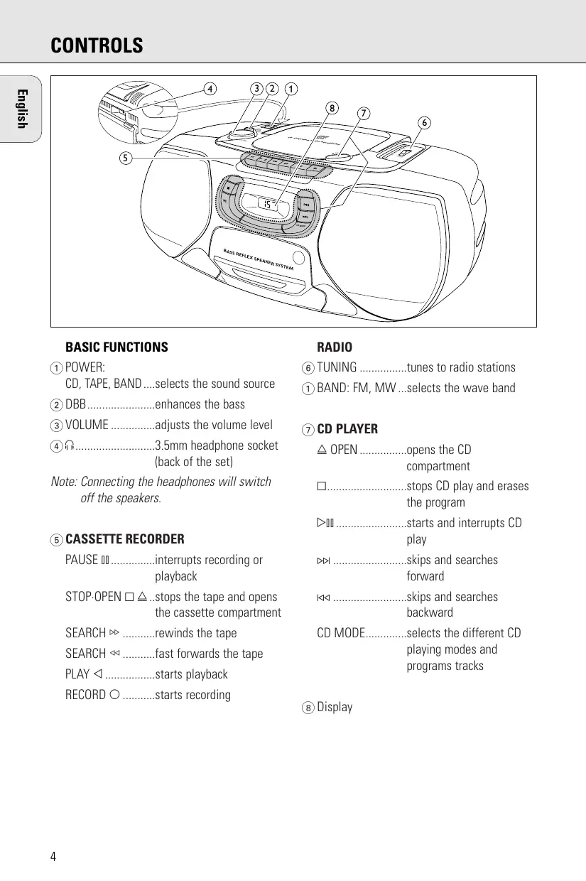 CD player ...........................7–9 Cassette recorder ..........10–11 General information.............12 Troubleshooting ...................13 Português Français BASIC FUNCTIONS 1 POWER: CD, TAPE, BAND ....selects the sound source RADIO 6 TUNING ................tunes to radio stations 1 BAND: FM, MW ...selects the wave band 2 DBB.......................enhances the bass 3 VOLUME ...............adjusts the volume level 7 CD PLAYER 4 p...........................3.5mm headphone socket (back of the set) / OPEN ................opens the CD compartment Note: Connecting the headphones will switch off the speakers. 9...........................stops CD play and erases the program 5 CASSETTE RECORDER 2; ........................starts and interrupts CD play PAUSE ; ...............interrupts recording or playback § .........................skips and searches forward STOP·OPEN 9 / ..stops the tape and opens the cassette compartment ∞ .........................skips and searches backward SEARCH 6 ...........rewinds the tape CD MODE..............selects the different CD playing modes and programs tracks SEARCH 5 ...........fast forwards the tape PLAY 1 .................starts playback RECORD 0 ...........starts recording