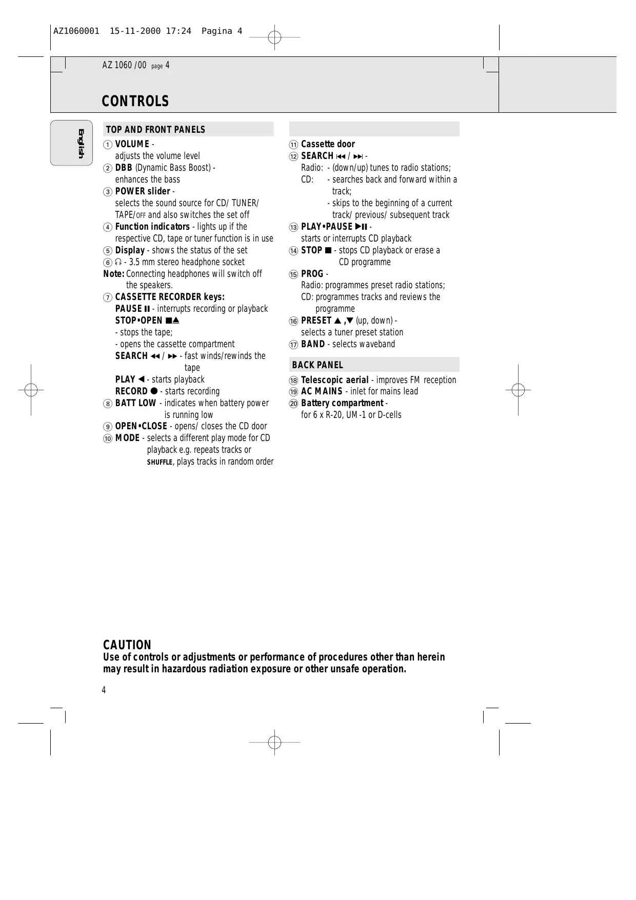 - Telescopic aerial - improves FM reception ( AC MAINS - inlet for mains lead ) Battery compartment for 6 x R-20, UM-1 or D-cells CAUTION Use of controls or adjustments or performance of procedures other than herein may result in hazardous radiation exposure or other unsafe operation.
