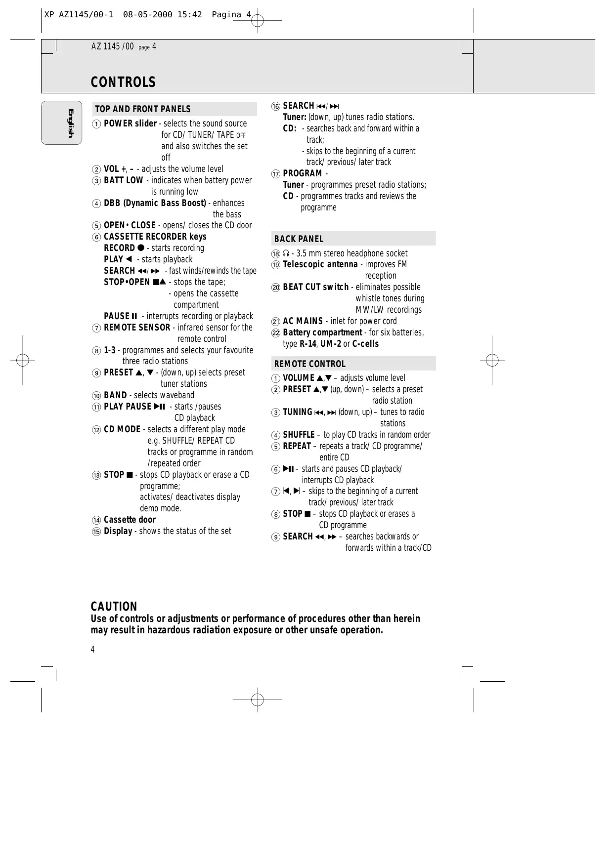 - p - 3.5 mm stereo headphone socket ( Telescopic antenna - improves FM reception ) BEAT CUT switch - eliminates possible whistle tones during MW/LW recordings ¡ AC MAINS - inlet for power cord ™ Battery compartment - for six batteries, type R-14, UM-2 or C-cells REMOTE CONTROL 1 VOLUME 3,4 – adjusts volume level 2 PRESET 3,4 (up, down) – selects a preset radio station 3 TUNING ∞, § (down, up) – tunes to radio stations 4 SHUFFLE – to play CD tracks in random order 5 REPEAT – repeats a track/ CD programme/ entire CD 6 2; – starts and pauses CD playback/ interrupts CD playback 7 ¡, ™ – skips to the beginning of a current track/ previous/ later track 8 STOP 9 – stops CD playback or erases a CD programme 9 SEARCH 5, 6 – searches backwards or forwards within a track/CD CAUTION Use of controls or adjustments or performance of procedures other than herein may result in hazardous radiation exposure or other unsafe operation.