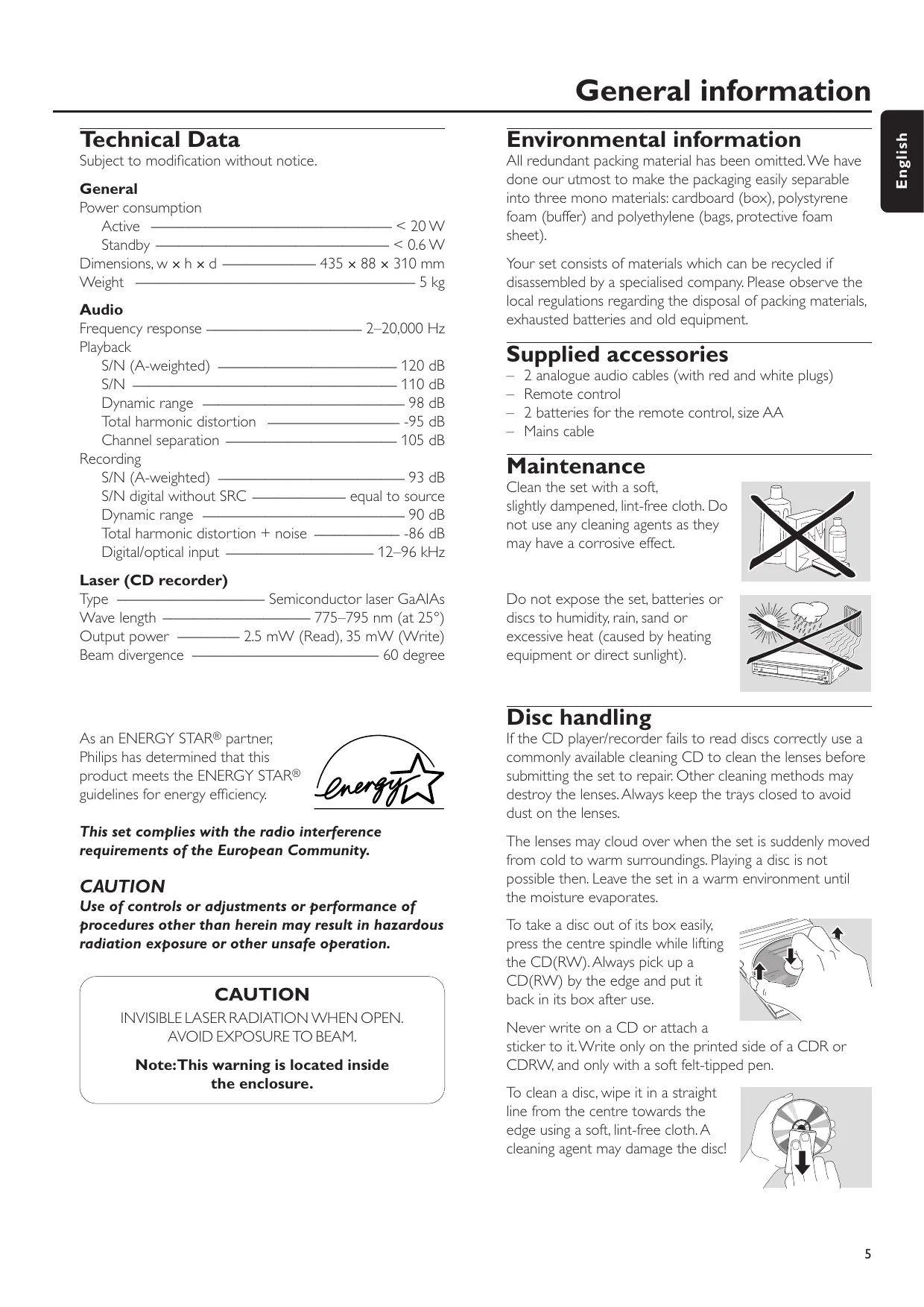 Technical Data Environmental information Subject to modification without notice. All redundant packing material has been omitted.We have done our utmost to make the packaging easily separable into three mono materials: cardboard (box), polystyrene foam (buffer) and polyethylene (bags, protective foam sheet). General Power consumption Active _______________________________ < 20 W Standby ______________________________ < 0.6 W Dimensions, w × h × d ____________ 435 × 88 × 310 mm Weight ____________________________________ 5 kg Audio Frequency response ____________________ 2–20,000 Hz Playback S/N (A-weighted) _______________________ 120 dB S/N __________________________________ 110 dB Dynamic range __________________________ 98 dB Total harmonic distortion _________________ -95 dB Channel separation ______________________ 105 dB Recording S/N (A-weighted) ________________________ 93 dB S/N digital without SRC ____________ equal to source Dynamic range __________________________ 90 dB Total harmonic distortion + noise ___________ -86 dB Digital/optical input ___________________ 12–96 kHz Laser (CD recorder) Type ___________________ Semiconductor laser GaAIAs Wave length ___________________ 775–795 nm (at 25°) Output power ________ 2.5 mW (Read), 35 mW (Write) Beam divergence ________________________ 60 degree English General information Your set consists of materials which can be recycled if disassembled by a specialised company. Please observe the local regulations regarding the disposal of packing materials, exhausted batteries and old equipment. Supplied accessories
