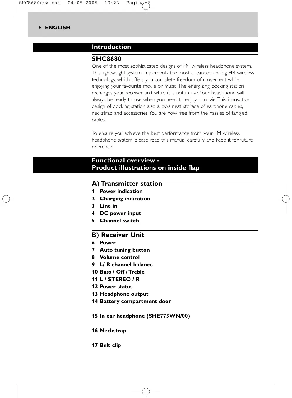 SHC8680new.qxd 04-05-2005 10:23 Pagina 6 6 ENGLISH Introduction SHC8680 One of the most sophisticated designs of FM wireless headphone system. This lightweight system implements the most advanced analog FM wireless technology, which offers you complete freedom of movement while enjoying your favourite movie or music.The energizing docking station recharges your receiver unit while it is not in use.Your headphone will always be ready to use when you need to enjoy a movie.This innovative design of docking station also allows neat storage of earphone cables, neckstrap and accessories.You are now free from the hassles of tangled cables! To ensure you achieve the best performance from your FM wireless headphone system, please read this manual carefully and keep it for future reference. Functional overview Product illustrations on inside flap A) Transmitter station