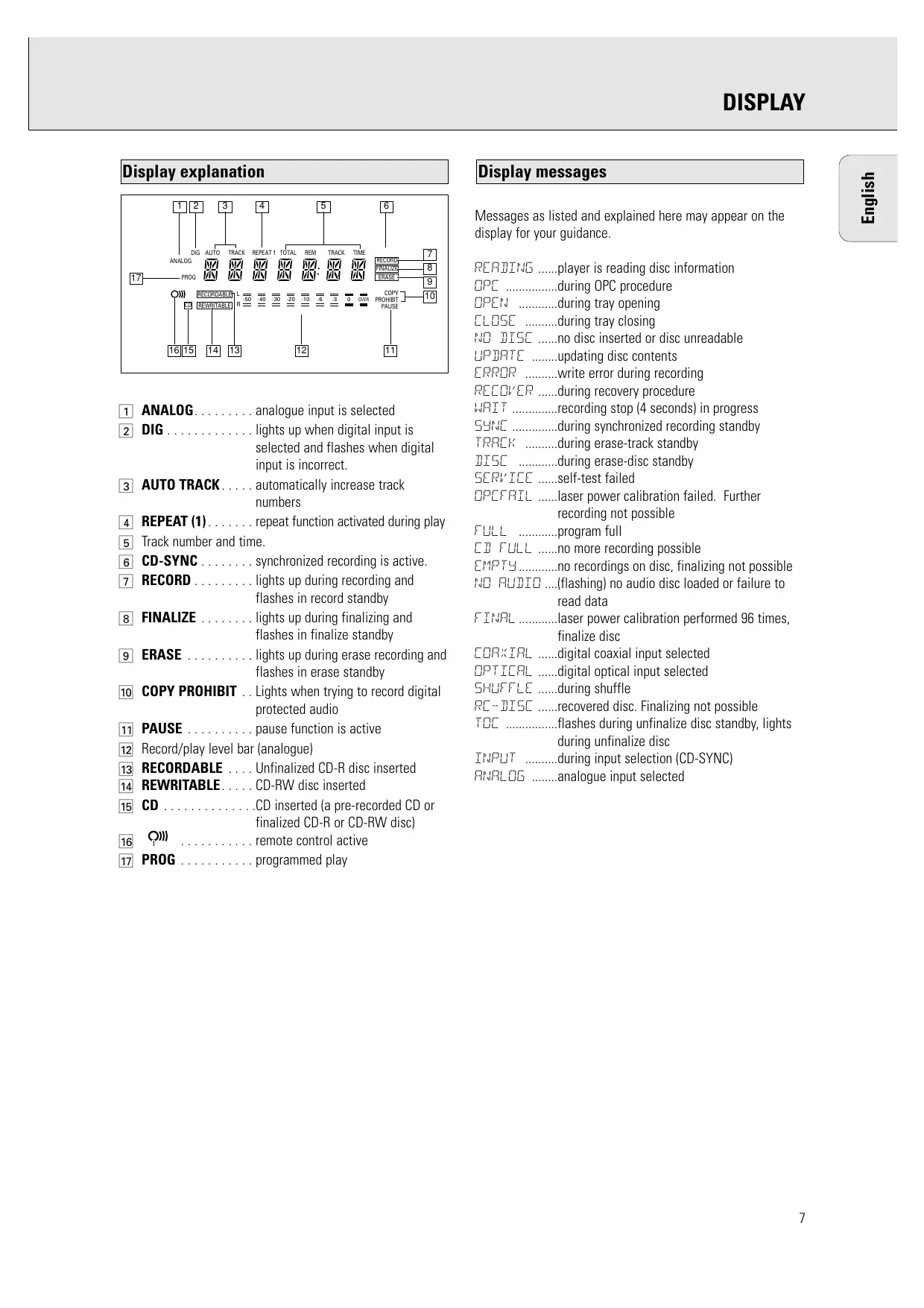 1 ANALOG... analogue input is selected 2 DIG ... lights up when digital input is selected and flashes when digital input is incorrect. 3 AUTO TRACK ... automatically increase track numbers 4 REPEAT (1) ... repeat function activated during play 5 Track number and time. 6 CD-SYNC ... synchronized recording is active. 7 RECORD ... lights up during recording and flashes in record standby 8 FINALIZE ... lights up during finalizing and flashes in finalize standby 9 ERASE ... lights up during erase recording and flashes in erase standby 0 COPY PROHIBIT ... Lights when trying to record digital protected audio ! PAUSE ... pause function is active @ Record/play level bar (analogue) # RECORDABLE ... Unfinalized CD-R disc inserted $ REWRITABLE... CD-RW disc inserted % CD ...CD inserted (a pre-recorded CD or finalized CD-R or CD-RW disc) ... remote control active & PROG ... programmed play READING ......player is reading disc information OPC ................during OPC procedure OPEN ............during tray opening CLOSE ..........during tray closing NO DISC ......no disc inserted or disc unreadable UPDATE ........updating disc contents ERROR ..........write error during recording RECOVER ......during recovery procedure WAIT ..............recording stop (4 seconds) in progress SYNC ..............during synchronized recording standby TRACK ..........during erase-track standby DISC ............during erase-disc standby SERVICE ......self-test failed OPCFAIL ......laser power calibration failed. Further recording not possible FULL ............program full CD FULL ......no more recording possible EMPTY............no recordings on disc, finalizing not possible NO AUDIO ....(flashing) no audio disc loaded or failure to read data FINAL............laser power calibration performed 96 times, finalize disc COAXIAL ......digital coaxial input selected OPTICAL ......digital optical input selected SHUFFLE ......during shuffle RC-DISC ......recovered disc. Finalizing not possible TOC ................flashes during unfinalize disc standby, lights during unfinalize disc INPUT ..........during input selection (CD-SYNC) ANALOG ........analogue input selected