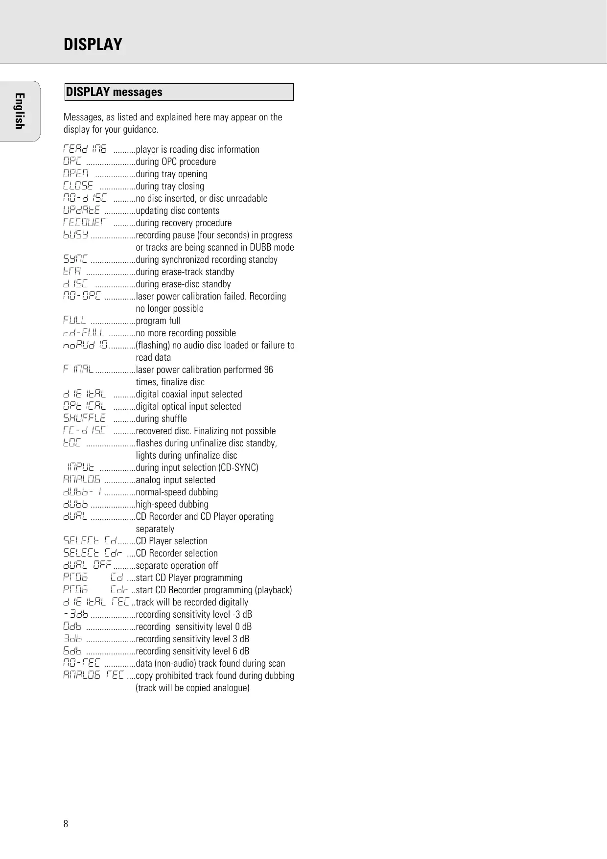 - To interrupt recording, press PAUSE. ‹ RECORD will start to flash. Resume at step 1. After recording the display will show UPDATE for several seconds. Note: With AUTO TRACK on, the recorder will stop automatically after a 20 seconds silence. With AUTO TRACK off, the AUTO STOP mode is disabled. RECORDING English Finalizing CD-R & CD-RW discs Finalizing is a simple procedure that is necessary in order to play back the discs on the CD Recorder/Player or on an external CD player. Note: Finalizing prevents any further recording on a CD-R. A finalized CD-RW must be unfinalized to allow further recording or erasure of tracks. 1 Make sure the disc (in the CD Recorder/Player) is absolutely free of scratches and dust particles. 2 With the recorder stopped press FINALIZE and then within 3 seconds press RECORD. RECORD ERASE