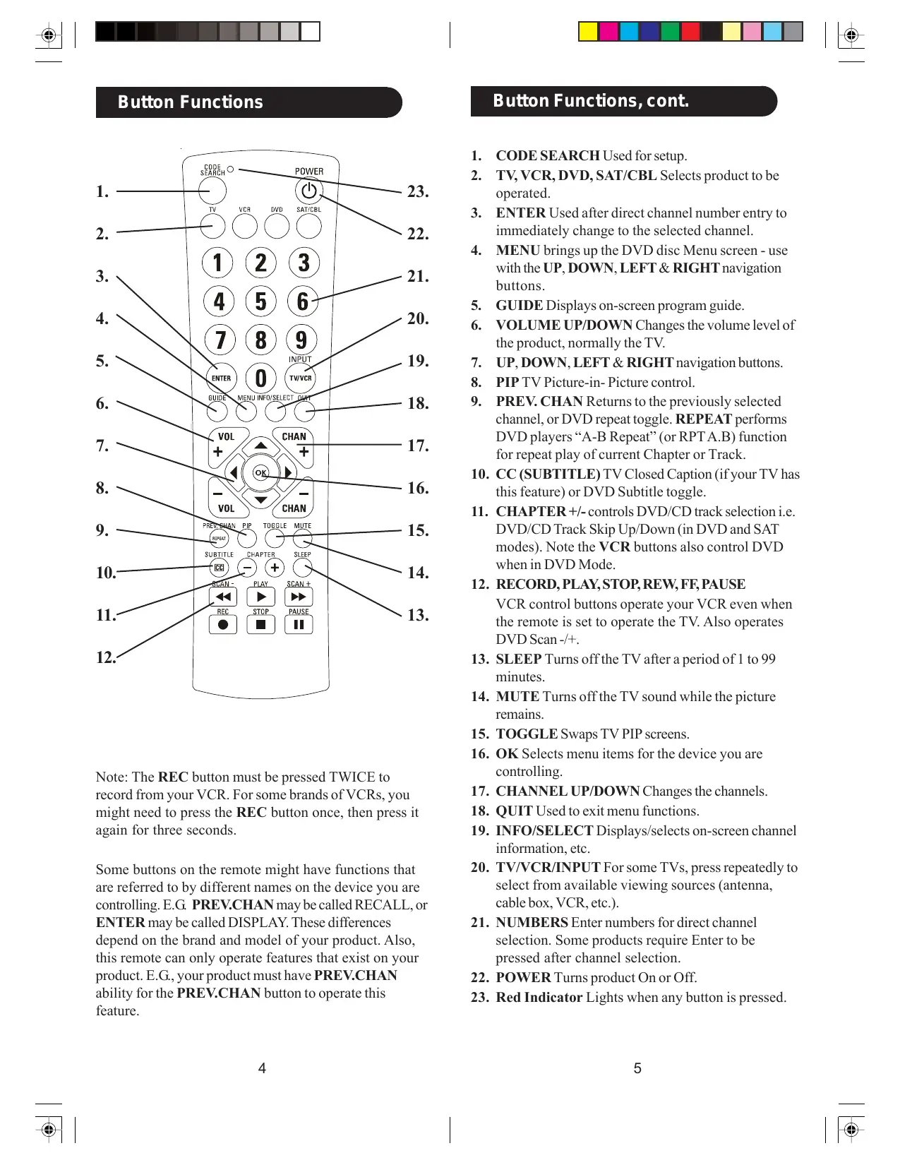 Note: The REC button must be pressed TWICE to record from your VCR. For some brands of VCRs, you might need to press the REC button once, then press it again for three seconds. Some buttons on the remote might have functions that are referred to by different names on the device you are controlling. E.G. PREV.CHAN may be called RECALL, or ENTER may be called DISPLAY. These differences depend on the brand and model of your product. Also, this remote can only operate features that exist on your product. E.G., your product must have PREV.CHAN ability for the PREV.CHAN button to operate this feature.