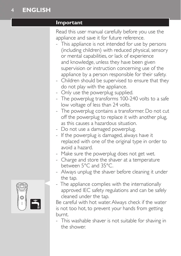 English Important Read this user manual carefully before you use the appliance and save it for future reference. - This appliance is not intended for use by persons (including children) with reduced physical, sensory or mental capabilities, or lack of experience and knowledge, unless they have been given supervision or instruction concerning use of the appliance by a person responsible for their safety. - Children should be supervised to ensure that they do not play with the appliance. - Only use the powerplug supplied. - The powerplug transforms 100-240 volts to a safe low voltage of less than 24 volts. - The powerplug contains a transformer. Do not cut off the powerplug to replace it with another plug, as this causes a hazardous situation. - Do not use a damaged powerplug. - If the powerplug is damaged, always have it replaced with one of the original type in order to avoid a hazard. - Make sure the powerplug does not get wet. - Charge and store the shaver at a temperature between 5°C and 35°C. - Always unplug the shaver before cleaning it under the tap. - The appliance complies with the internationally approved IEC safety regulations and can be safely cleaned under the tap. Be careful with hot water. Always check if the water is not too hot, to prevent your hands from getting burnt. - This washable shaver is not suitable for shaving in the shower. English