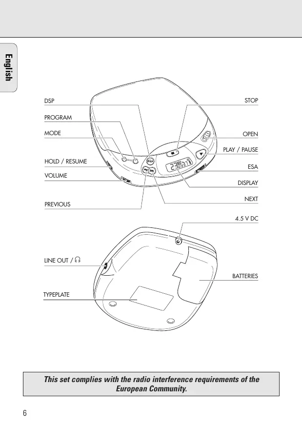 DISPLAY......................Window for showing the different playing modes, tracks and times § .................................Button for selecting the next music track or, if held down, for searching forward for a particular passage on the CD ∞ .................................Button for selecting the previous music track or, if held down, for searching·backward for a particular passage on the CD VOLUME......................Control for adjusting the volume at the headphone output RESUME/HOLD ..........Switch for activating the RESUME function (resuming CD play) and/or HOLD (blocking all buttons) function MODE 0......................Button for selecting the different playing modes: SHUFFLE™SHUFFLE REPEAT ALL™REPEAT 1™REPEAT ALL ™SCAN™off PROG P........................Button for storing tracks in a program and for reviewing the program DSP ..............................Digital Sound Processing: Button for selecting the different sound settings at the headphone output: ROCK™POP™CAR™INCREDIBLE SURROUND™off STOP 9........................Button for stopping CD play, deleting various settings, switching off the CD player and activating charging. OPEN ...........................Slide control for opening the lid of the CD player 2; ................................Button for starting and pausing CD play ESA ..............................Electronic Shock Absorption: Switch for activating the electronic buffer memory for an undisturbed sound LINE OUT / p ..............Headphone socket (3.5 mm) 4,5 V DC.......................Socket for external power supply Battery compartment for inserting batteries Note: In case of power supply via the DC jack (mains adapter or cigarette lighter in your car) the display is backlighted. In battery mode, the illumination is activated for 10 seconds after key operations.