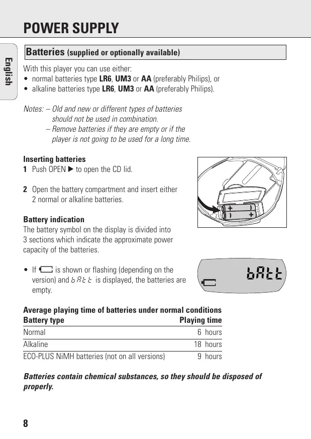 Notes: - Old and new or different types of batteries should not be used in combination. Remove batteries if they are empty or if the player is not going to be used for a long time.