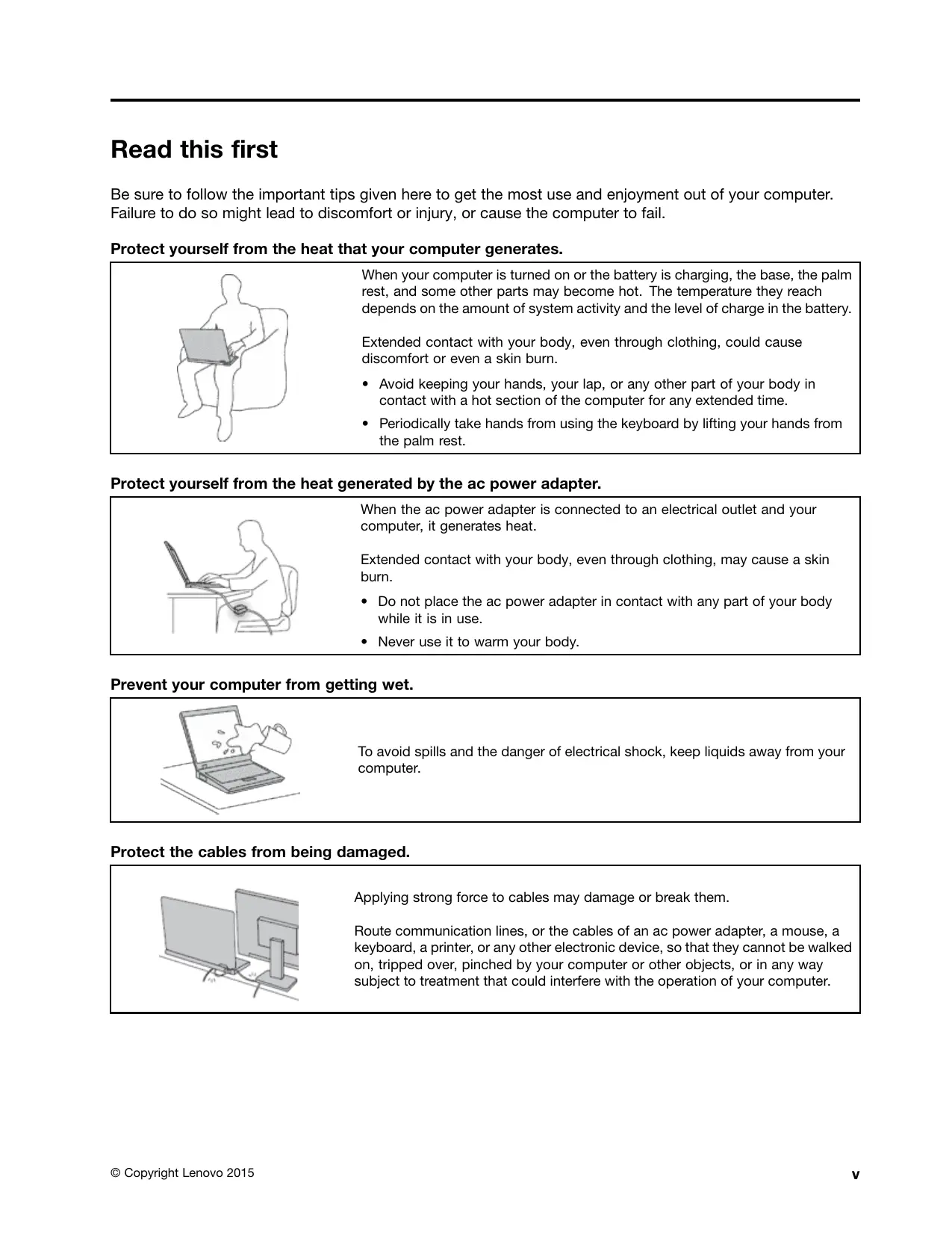 - Never use it to warm your body. Prevent your computer from getting wet. To avoid spills and the danger of electrical shock, keep liquids away from your computer. Protect the cables from being damaged. Applying strong force to cables may damage or break them. Route communication lines, or the cables of an ac power adapter, a mouse, a keyboard, a printer, or any other electronic device, so that they cannot be walked on, tripped over, pinched by your computer or other objects, or in any way subject to treatment that could interfere with the operation of your computer. © Copyright Lenovo 2015