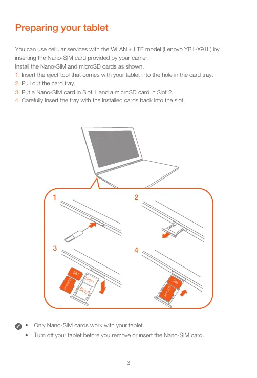 Preparing your tablet You can use cellular services with the WLAN + LTE model (Lenovo YB1-X91L) by inserting the Nano-SIM card provided by your carrier. Install the Nano-SIM and microSD cards as shown. 1. Insert the eject tool that comes with your tablet into the hole in the card tray. 2. Pull out the card tray. 3. Put a Nano-SIM card in Slot 1 and a microSD card in Slot 2. 4. Carefully insert the tray with the installed cards back into the slot.