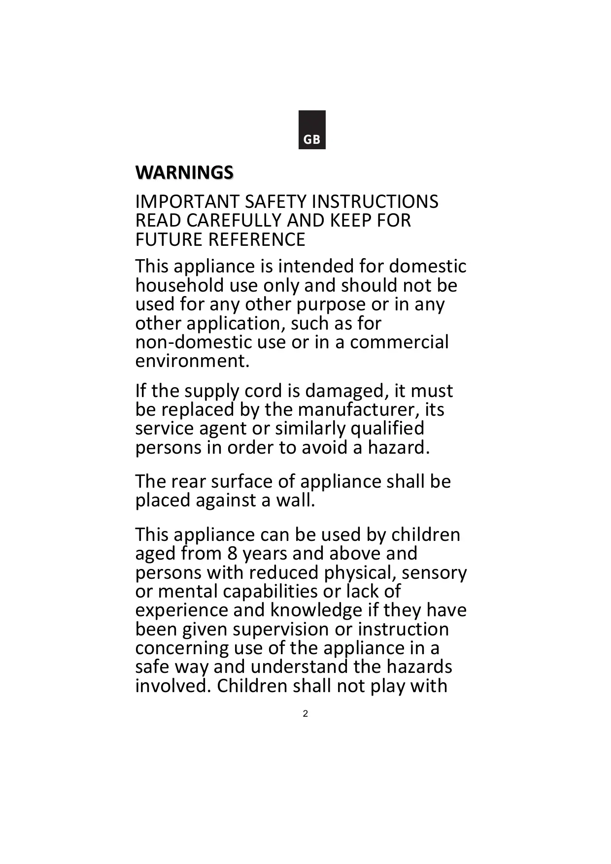 FUTURE REFERENCE This appliance is intended for domestic household use only and should not be used for any other purpose or in any other application, such as for non-domestic use or in a commercial environment. If the supply cord is damaged, it must be replaced by the manufacturer, its service agent or similarly qualified persons in order to avoid a hazard. The rear surface of appliance shall be placed against a wall. This appliance can be used by children aged from 8 years and above and persons with reduced physical, sensory or mental capabilities or lack of experience and knowledge if they have been given supervision or instruction concerning use of the appliance in a safe way and understand the hazards involved. Children shall not play with