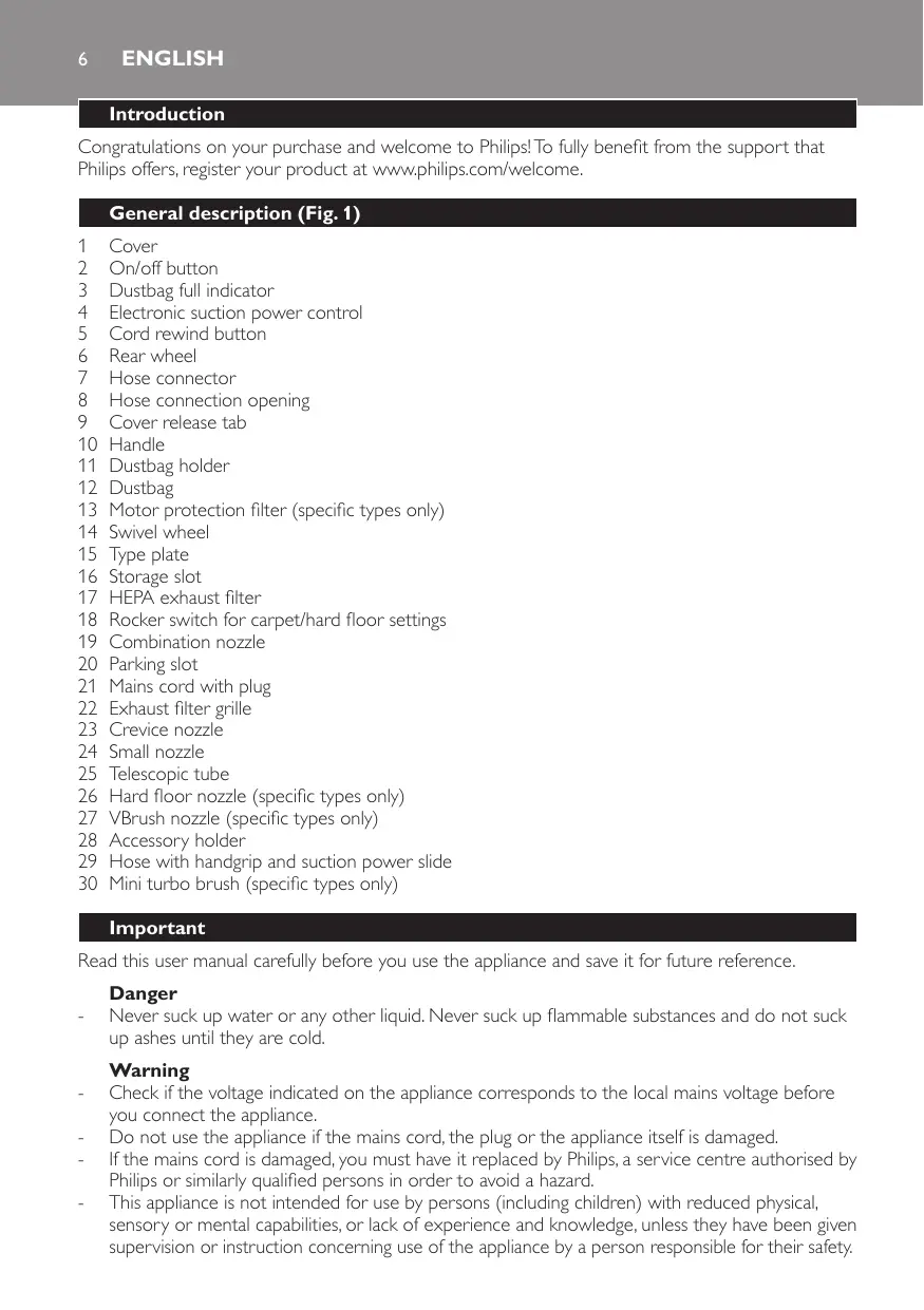 Read this user manual carefully before you use the appliance and save it for future reference. Danger -- Never suck up water or any other liquid. Never suck up flammable substances and do not suck up ashes until they are cold. Warning -- Check if the voltage indicated on the appliance corresponds to the local mains voltage before you connect the appliance. -- Do not use the appliance if the mains cord, the plug or the appliance itself is damaged. -- If the mains cord is damaged, you must have it replaced by Philips, a service centre authorised by Philips or similarly qualified persons in order to avoid a hazard. -- This appliance is not intended for use by persons (including children) with reduced physical, sensory or mental capabilities, or lack of experience and knowledge, unless they have been given supervision or instruction concerning use of the appliance by a person responsible for their safety.