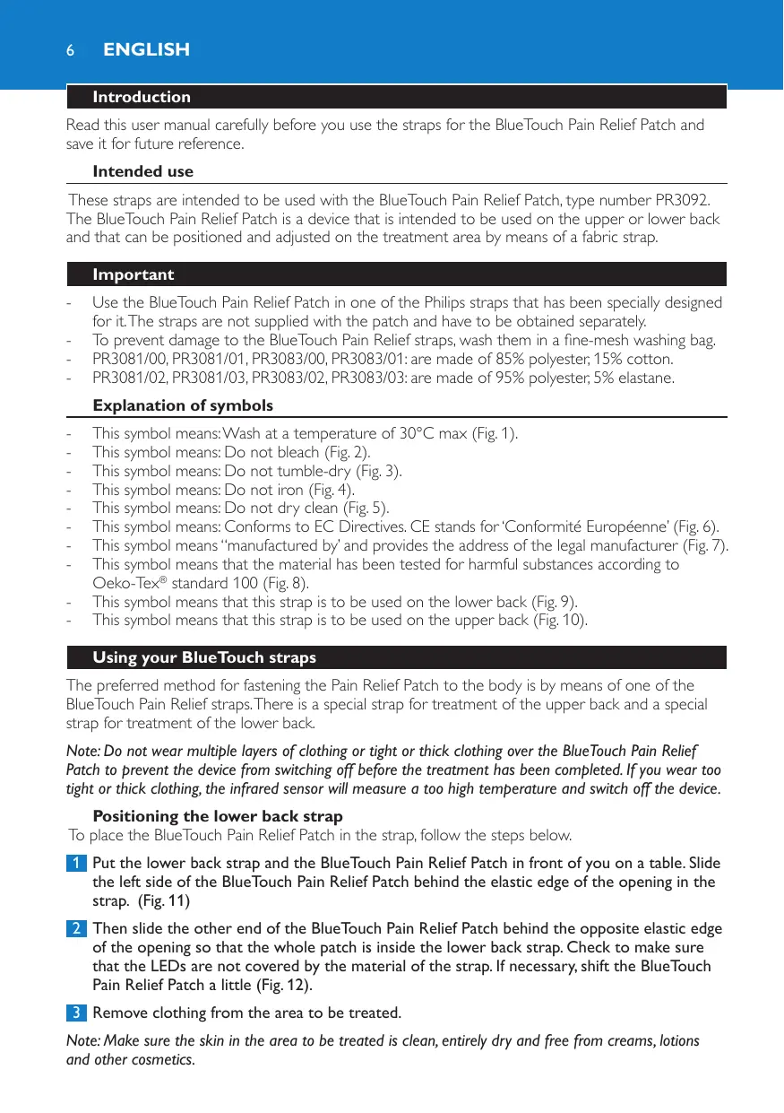 English Introduction Read this user manual carefully before you use the straps for the BlueTouch Pain Relief Patch and save it for future reference. Intended use These straps are intended to be used with the BlueTouch Pain Relief Patch, type number PR3092. The BlueTouch Pain Relief Patch is a device that is intended to be used on the upper or lower back and that can be positioned and adjusted on the treatment area by means of a fabric strap. Important -- Use the BlueTouch Pain Relief Patch in one of the Philips straps that has been specially designed for it. The straps are not supplied with the patch and have to be obtained separately. -- To prevent damage to the BlueTouch Pain Relief straps, wash them in a fine-mesh washing bag. -- PR3081/00, PR3081/01, PR3083/00, PR3083/01: are made of 85% polyester, 15% cotton. -- PR3081/02, PR3081/03, PR3083/02, PR3083/03: are made of 95% polyester, 5% elastane. Explanation of symbols