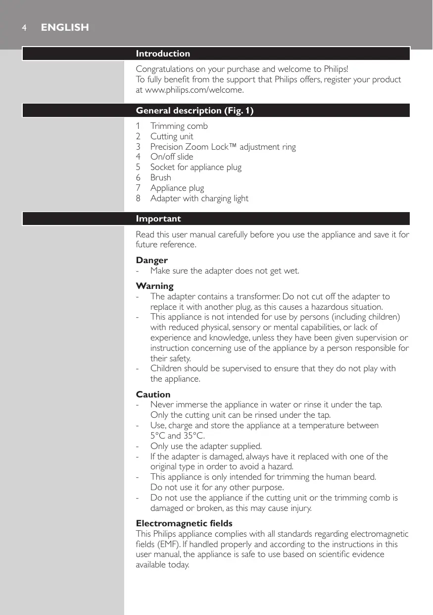 Trimming comb Cutting unit Precision Zoom Lock™ adjustment ring On/off slide Socket for appliance plug Brush Appliance plug Adapter with charging light Important Read this user manual carefully before you use the appliance and save it for future reference. Danger -- Make sure the adapter does not get wet. Warning -- The adapter contains a transformer. Do not cut off the adapter to replace it with another plug, as this causes a hazardous situation. -- This appliance is not intended for use by persons (including children) with reduced physical, sensory or mental capabilities, or lack of experience and knowledge, unless they have been given supervision or instruction concerning use of the appliance by a person responsible for their safety. -- Children should be supervised to ensure that they do not play with the appliance. Caution -- Never immerse the appliance in water or rinse it under the tap. Only the cutting unit can be rinsed under the tap. -- Use, charge and store the appliance at a temperature between 5°C and 35°C. -- Only use the adapter supplied. -- If the adapter is damaged, always have it replaced with one of the original type in order to avoid a hazard. -- This appliance is only intended for trimming the human beard. Do not use it for any other purpose. -- Do not use the appliance if the cutting unit or the trimming comb is damaged or broken, as this may cause injury. Electromagnetic fields This Philips appliance complies with all standards regarding electromagnetic fields (EMF). If handled properly and according to the instructions in this user manual, the appliance is safe to use based on scientific evidence available today. English