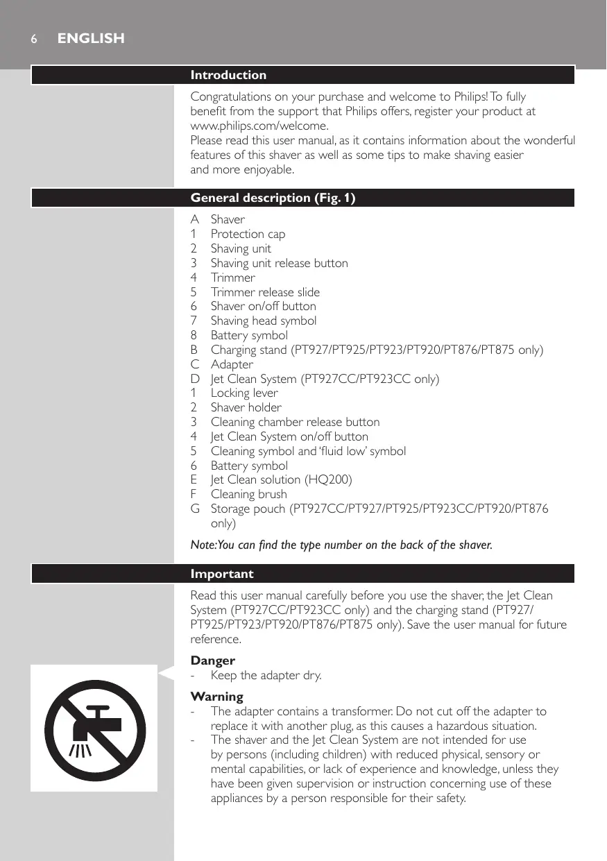 Shaver Protection cap Shaving unit Shaving unit release button Trimmer Trimmer release slide Shaver on/off button Shaving head symbol Battery symbol Charging stand (PT927/PT925/PT923/PT920/PT876/PT875 only) Adapter Jet Clean System (PT927CC/PT923CC only) Locking lever Shaver holder Cleaning chamber release button Jet Clean System on/off button Cleaning symbol and ‘fluid low’ symbol Battery symbol Jet Clean solution (HQ200) Cleaning brush Storage pouch (PT927CC/PT927/PT925/PT923CC/PT920/PT876 only) Note:You can find the type number on the back of the shaver. Important Read this user manual carefully before you use the shaver, the Jet Clean System (PT927CC/PT923CC only) and the charging stand (PT927/ PT925/PT923/PT920/PT876/PT875 only). Save the user manual for future reference. Danger -- Keep the adapter dry. Warning -- The adapter contains a transformer. Do not cut off the adapter to replace it with another plug, as this causes a hazardous situation. -- The shaver and the Jet Clean System are not intended for use by persons (including children) with reduced physical, sensory or mental capabilities, or lack of experience and knowledge, unless they have been given supervision or instruction concerning use of these appliances by a person responsible for their safety. English