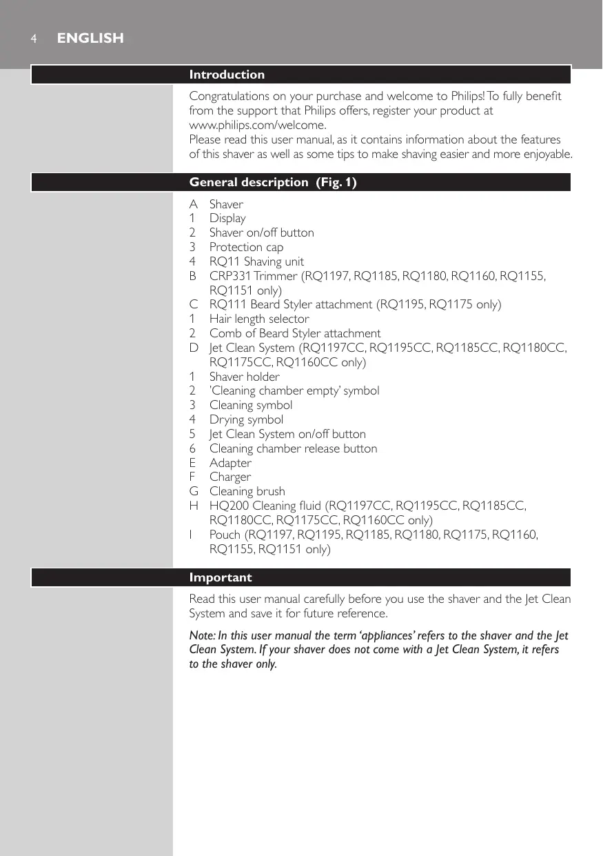 Display Shaver on/off button Protection cap RQ11 Shaving unit CRP331 Trimmer (RQ1197, RQ1185, RQ1180, RQ1160, RQ1155, RQ1151 only) RQ111 Beard Styler attachment (RQ1195, RQ1175 only) Hair length selector Comb of Beard Styler attachment Jet Clean System (RQ1197CC, RQ1195CC, RQ1185CC, RQ1180CC, RQ1175CC, RQ1160CC only) Shaver holder ’Cleaning chamber empty’ symbol Cleaning symbol Drying symbol Jet Clean System on/off button Cleaning chamber release button Adapter Charger Cleaning brush HQ200 Cleaning fluid (RQ1197CC, RQ1195CC, RQ1185CC, RQ1180CC, RQ1175CC, RQ1160CC only) Pouch (RQ1197, RQ1195, RQ1185, RQ1180, RQ1175, RQ1160, RQ1155, RQ1151 only)