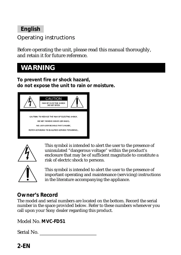 English Operating instructions Before operating the unit, please read this manual thoroughly, and retain it for future reference. WARNING To prevent fire or shock hazard, do not expose the unit to rain or moisture. This symbol is intended to alert the user to the presence of uninsulated “dangerous voltage” within the product’s enclosure that may be of sufficient magnitude to constitute a risk of electric shock to persons. This symbol is intended to alert the user to the presence of important operating and maintenance (servicing) instructions in the literature accompanying the appliance. Owner’s Record The model and serial numbers are located on the bottom. Record the serial number in the space provided below. Refer to these numbers whenever you call upon your Sony dealer regarding this product. Model No. MVC-FD51 Serial No. 2-EN CAUTION Never expose the battery pack to temperatures above 140°F (60°C), such as in a car parked in the sun or under direct sunlight. TO PREVENT ELECTRIC SHOCK, DO NOT USE THIS POLARIZED AC PLUG WITH AN EXTENSION CORD, RECEPTACLE OR OTHER OUTLET UNLESS THE BLADES CAN BE FULLY INSERTED TO PREVENT BLADE EXPOSURE. You are cautioned that any changes or modifications not expressly approved in this manual could void your authority to operate this equipment. Note: This equipment has been tested and found to comply with the limits for a Class B digital device, pursuant to Part 15 of the FCC Rules. These limits are designed to provide reasonable protection against harmful interference in a residential installation. This equipment generates, uses, and can radiate radio frequency energy and, if not installed and used in accordance with the instructions, may cause harmful interference to radio communications. However, there is no guarantee that interference will not occur in a particular installation. If this equipment does cause harmful interference to radio or television reception, which can be determined by turning the equipment off and on, the user is encouraged to try to correct the interference by one or more of the following measures: – Reorient or relocate the receiving antenna. – Increase the separation between the equipment and receiver. – Connect the equipment into an outlet on a circuit different from that to which the receiver is connected. – Consult the dealer or an experienced radio/TV technician for help. For the Customers in the United States and CANADA DISPOSAL OF LITHIUM ION BATTERY. LITHIUM ION BATTERY. DISPOSE OF PROPERLY. You can return you unwanted lithium ion batteries to your nearest Sony Service Center or Factory Service Center. Note: In some areas the disposal of lithium ion batteries in household or business trash may be prohibited. For the Sony Service Center nearest you call 1-800-222-SONY (United States only) For the Factory Service Center nearest you call 416-499-SONY (Canada only) Caution: Do not handle damaged or leaking lithium ion batteries. 3-EN NOTICE FOR THE CUSTOMERS IN THE UNITED KINGDOM A moulded plug complying with BS 1363 is fitted to this equipment for your safety and convenience. Should the fuse in the plug supplied need to be replaced, a 5 AMP fuse approved by ASTA or BSI to BS 1362, (i.e., marked with 2 or @ mark) must be used. If the plug supplied with this equipment has a detachable fuse cover, be sure to attach the fuse cover after you change the fuse. Never use the plug without the fuse cover. If you should lose the fuse cover, please contact your nearest Sony service station. ATTENTION The electromagnetic fields at the specific frequencies may influence the picture of this camera.
