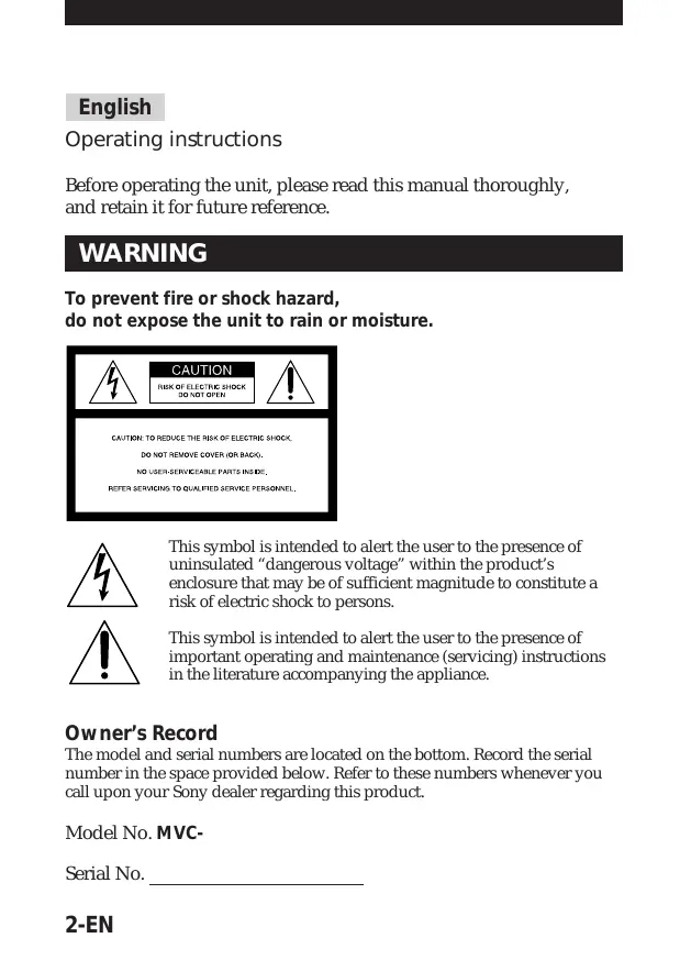 English Operating instructions Before operating the unit, please read this manual thoroughly, and retain it for future reference. WARNING To prevent fire or shock hazard, do not expose the unit to rain or moisture. This symbol is intended to alert the user to the presence of uninsulated “dangerous voltage” within the product’s enclosure that may be of sufficient magnitude to constitute a risk of electric shock to persons. This symbol is intended to alert the user to the presence of important operating and maintenance (servicing) instructions in the literature accompanying the appliance. Owner’s Record The model and serial numbers are located on the bottom. Record the serial number in the space provided below. Refer to these numbers whenever you call upon your Sony dealer regarding this product. Model No. MVCSerial No. 2-EN CAUTION Never expose the battery pack to temperatures above 140°F (60°C), such as in a car parked in the sun or under direct sunlight. TO PREVENT ELECTRIC SHOCK, DO NOT USE THIS POLARIZED AC PLUG WITH AN EXTENSION CORD, RECEPTACLE OR OTHER OUTLET UNLESS THE BLADES CAN BE FULLY INSERTED TO PREVENT BLADE EXPOSURE. You are cautioned that any changes or modifications not expressly approved in this manual could void your authority to operate this equipment. Note: This equipment has been tested and found to comply with the limits for a Class B digital device, pursuant to Part 15 of the FCC Rules. These limits are designed to provide reasonable protection against harmful interference in a residential installation. This equipment generates, uses, and can radiate radio frequency energy and, if not installed and used in accordance with the instructions, may cause harmful interference to radio communications. However, there is no guarantee that interference will not occur in a particular installation. If this equipment does cause harmful interference to radio or television reception, which can be determined by turning the equipment off and on, the user is encouraged to try to correct the interference by one or more of the following measures: – Reorient or relocate the receiving antenna. – Increase the separation between the equipment and receiver. – Connect the equipment into an outlet on a circuit different from that to which the receiver is connected. – Consult the dealer or an experienced radio/TV technician for help. For the Customers in the United States and CANADA DISPOSAL OF LITHIUM ION BATTERY. LITHIUM ION BATTERY. DISPOSE OF PROPERLY. You can return you unwanted lithium ion batteries to your nearest Sony Service Center or Factory Service Center. Note: In some areas the disposal of lithium ion batteries in household or business trash may be prohibited. For the Sony Service Center nearest you call 1-800-222-SONY (United States only) For the Factory Service Center nearest you call 416-499-SONY (Canada only) Caution: Do not handle damaged or leaking lithium ion batteries. 3-EN NOTICE FOR THE CUSTOMERS IN THE UNITED KINGDOM A moulded plug complying with BS 1363 is fitted to this equipment for your safety and convenience. Should the fuse in the plug supplied need to be replaced, a 5 AMP fuse approved by ASTA or BSI to BS 1362, (i.e., marked with 2 or @ mark) must be used. If the plug supplied with this equipment has a detachable fuse cover, be sure to attach the fuse cover after you change the fuse. Never use the plug without the fuse cover. If you should lose the fuse cover, please contact your nearest Sony service station.