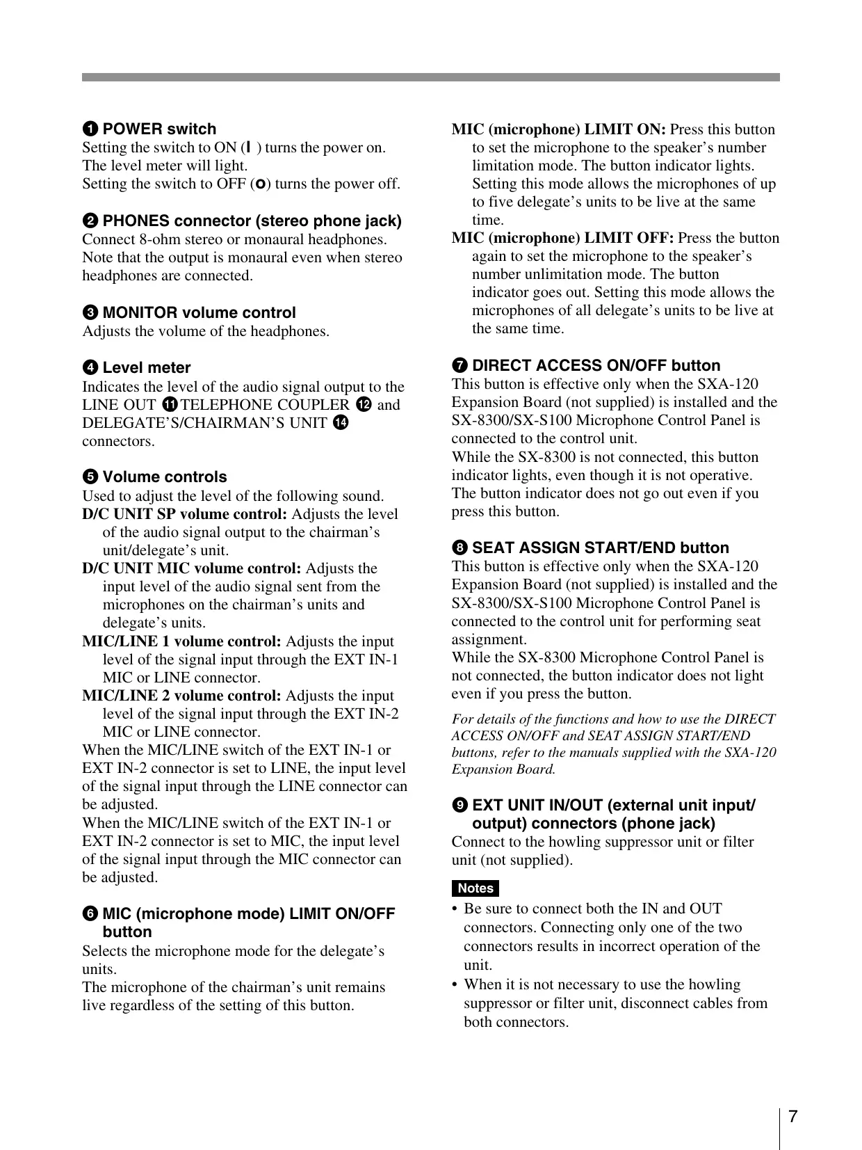 connectors. 5 Volume controls Used to adjust the level of the following sound. D/C UNIT SP volume control: Adjusts the level of the audio signal output to the chairman’s unit/delegate’s unit. D/C UNIT MIC volume control: Adjusts the input level of the audio signal sent from the microphones on the chairman’s units and delegate’s units. MIC/LINE 1 volume control: Adjusts the input level of the signal input through the EXT IN-1 MIC or LINE connector. MIC/LINE 2 volume control: Adjusts the input level of the signal input through the EXT IN-2 MIC or LINE connector. When the MIC/LINE switch of the EXT IN-1 or EXT IN-2 connector is set to LINE, the input level of the signal input through the LINE connector can be adjusted. When the MIC/LINE switch of the EXT IN-1 or EXT IN-2 connector is set to MIC, the input level of the signal input through the MIC connector can be adjusted. 6 MIC (microphone mode) LIMIT ON/OFF button Selects the microphone mode for the delegate’s units. The microphone of the chairman’s unit remains live regardless of the setting of this button. MIC (microphone) LIMIT ON: Press this button to set the microphone to the speaker’s number limitation mode. The button indicator lights. Setting this mode allows the microphones of up to five delegate’s units to be live at the same time. MIC (microphone) LIMIT OFF: Press the button again to set the microphone to the speaker’s number unlimitation mode. The button indicator goes out. Setting this mode allows the microphones of all delegate’s units to be live at the same time. 7 DIRECT ACCESS ON/OFF button This button is effective only when the SXA-120 Expansion Board (not supplied) is installed and the SX-8300/SX-S100 Microphone Control Panel is connected to the control unit. While the SX-8300 is not connected, this button indicator lights, even though it is not operative. The button indicator does not go out even if you press this button. 8 SEAT ASSIGN START/END button This button is effective only when the SXA-120 Expansion Board (not supplied) is installed and the SX-8300/SX-S100 Microphone Control Panel is connected to the control unit for performing seat assignment. While the SX-8300 Microphone Control Panel is not connected, the button indicator does not light even if you press the button. For details of the functions and how to use the DIRECT ACCESS ON/OFF and SEAT ASSIGN START/END buttons, refer to the manuals supplied with the SXA-120 Expansion Board. 9 EXT UNIT IN/OUT (external unit input/ output) connectors (phone jack) Connect to the howling suppressor unit or filter unit (not supplied). Notes