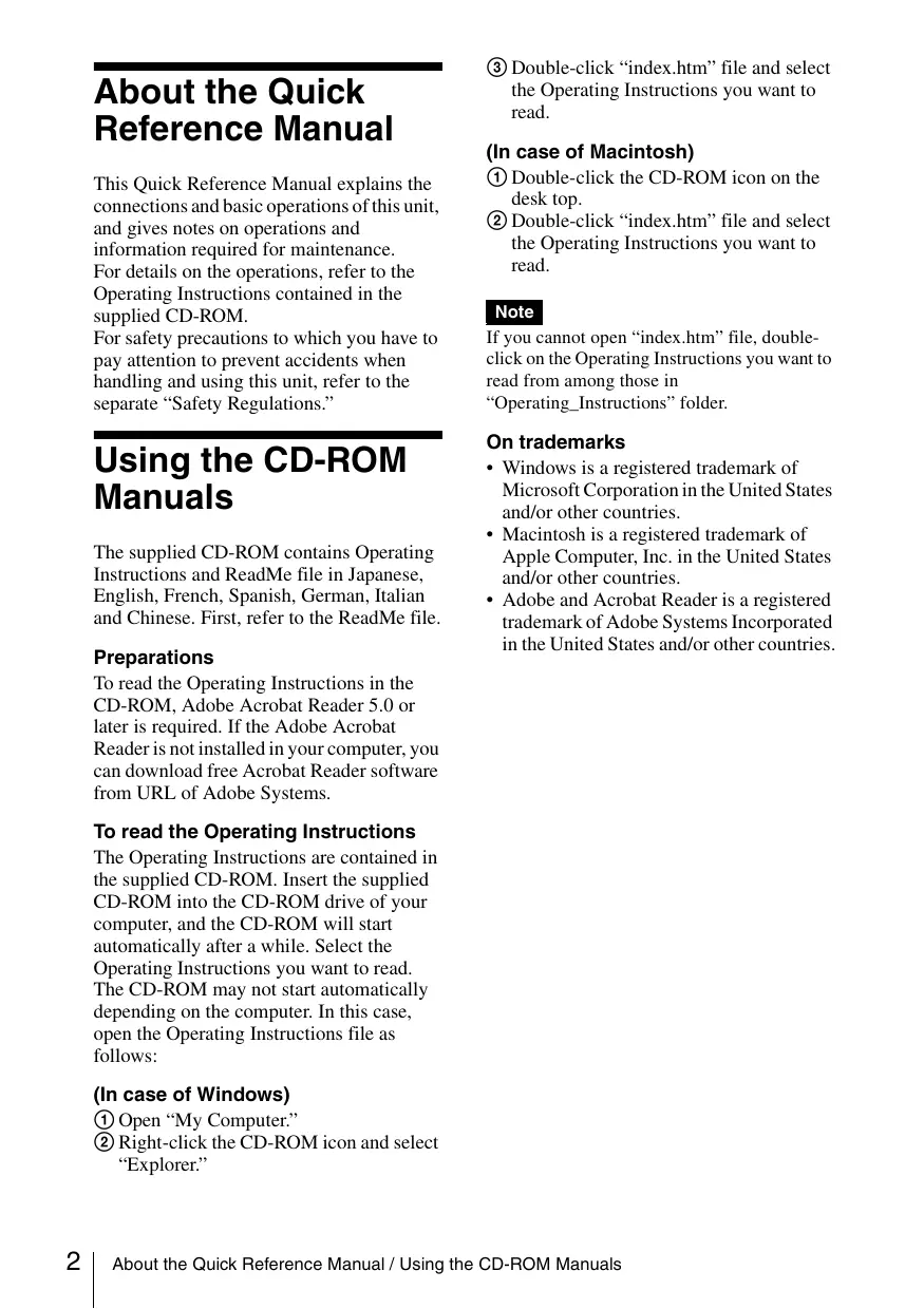 The supplied CD-ROM contains Operating Instructions and ReadMe file in Japanese, English, French, Spanish, German, Italian and Chinese. First, refer to the ReadMe file. Preparations To read the Operating Instructions in the CD-ROM, Adobe Acrobat Reader 5.0 or later is required. If the Adobe Acrobat Reader is not installed in your computer, you can download free Acrobat Reader software from URL of Adobe Systems.