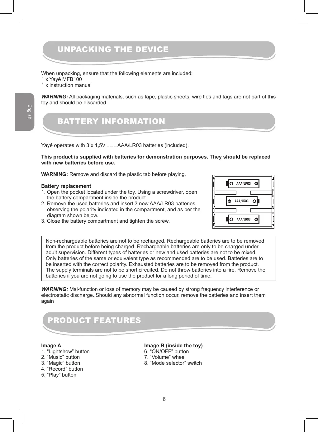Non-rechargeable batteries are not to be recharged. Rechargeable batteries are to be removed from the product before being charged. Rechargeable batteries are only to be charged under adult supervision. Different types of batteries or new and used batteries are not to be mixed. Only batteries of the same or equivalent type as recommended are to be used. Batteries are to be inserted with the correct polarity. Exhausted batteries are to be removed from the product. The supply terminals are not to be short circuited. Do not throw batteries into a fire. Remove the batteries if you are not going to use the product for a long period of time.