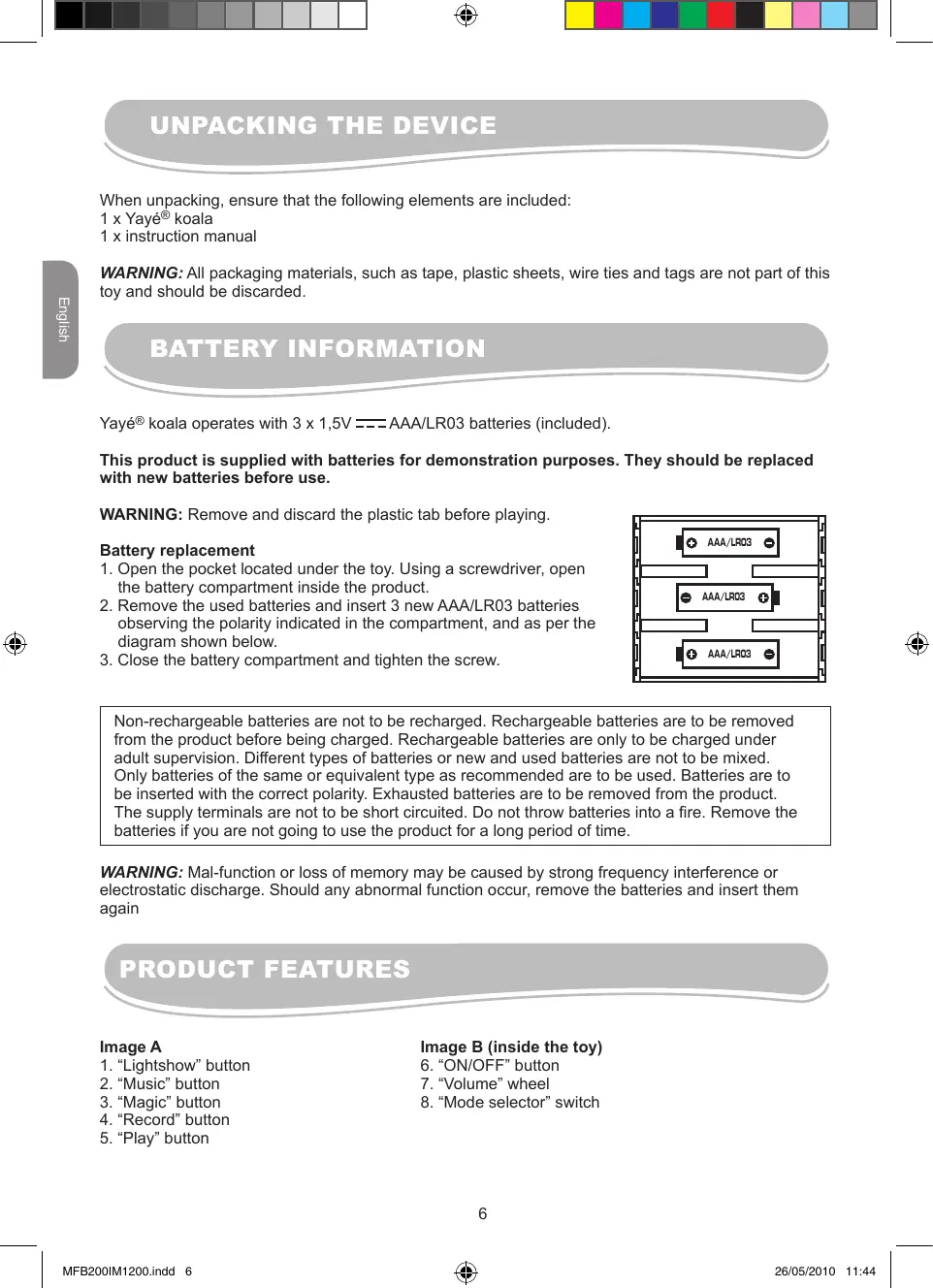 Yayé® koala operates with 3 x 1,5V --- AAA/LR03 batteries (included).