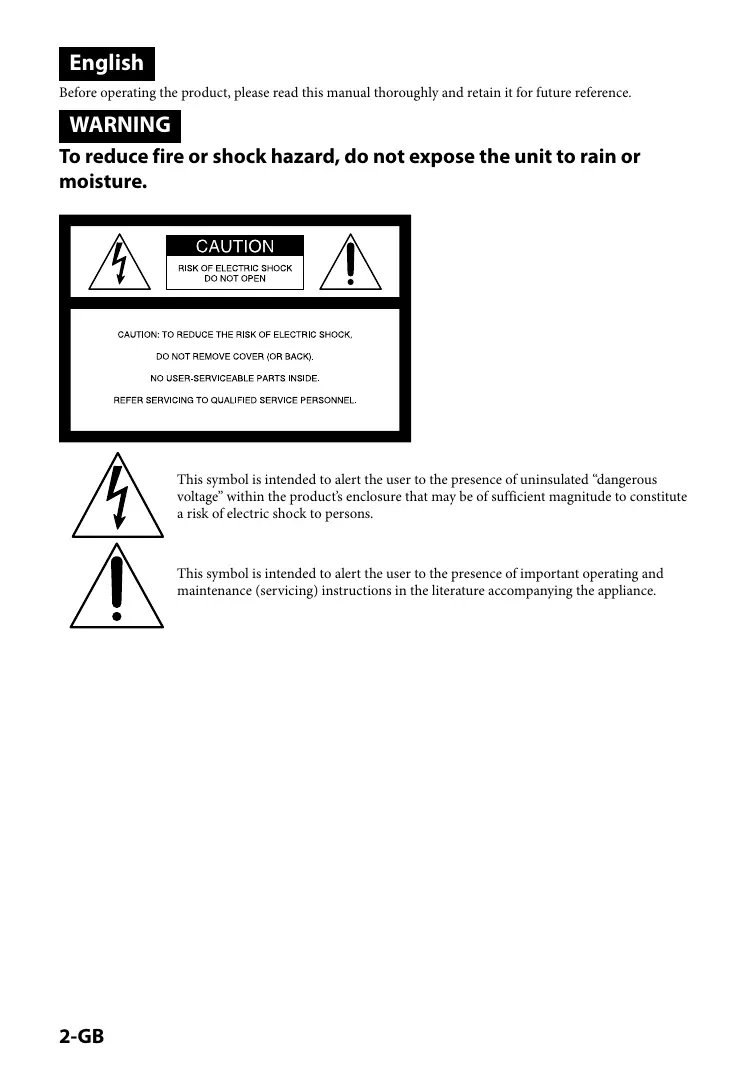 English Before operating the product, please read this manual thoroughly and retain it for future reference. WARNING To reduce fire or shock hazard, do not expose the unit to rain or moisture. This symbol is intended to alert the user to the presence of uninsulated “dangerous voltage” within the product’s enclosure that may be of sufficient magnitude to constitute a risk of electric shock to persons. This symbol is intended to alert the user to the presence of important operating and maintenance (servicing) instructions in the literature accompanying the appliance. -GB IMPORTANT SAFEGUARDS For your protection, please read these safety instructions completely before operating the appliance, and keep this manual for future reference. Carefully observe all warnings, precautions and instructions on the appliance, or the one described in the operating instructions and adhere to them. Use Power Sources This set should be operated only from the type of power source indicated on the marking label. If you are not sure of the type of electrical power supplied to your home, consult your dealer or local power company. For those sets designed to operate from battery power, or other sources, refer to the operating instructions. Polarization This set may be equipped with a polarized ac power cord plug (a plug having one blade wider than the other). This plug will fit into the power outlet only one way. This is a safety feature. If you are unable to insert the plug fully into the outlet, try reversing the plug. If the plug should still fail to fit, contact your electrician to have a suitable outlet installed. Do not defeat the safety purpose of the polarized plug by forcing it in. Overloading Do not overload wall outlets, extension cords or convenience receptacles beyond their capacity, since this can result in fire or electric shock. Object and Liquid Entry Never push objects of any kind into the set through openings as they may touch dangerous voltage points or short out parts that could result in a fire or electric shock. Never spill liquid of any kind on the set. Attachments Do not use attachments not recommended by the manufacturer, as they may cause hazards. Cleaning Unplug the set from the wall outlet before cleaning or polishing it. Do not use liquid cleaners or aerosol cleaners. Use a cloth lightly dampened with water for cleaning the exterior of the set. Installation Water and Moisture Do not use power-line operated sets near water − for example, near a bathtub, washbowl, kitchen sink, or laundry tub, in a wet basement, or near a swimming pool, etc. Power-Cord Protection Route the power cord so that it is not likely to be walked on or pinched by items placed upon or against them, paying particular attention to the plugs, receptacles, and the point where the cord exits from the appliance. Accessories Do not place the set on an unstable cart, stand, tripod, bracket, or table. The set may fall, causing serious injury to a child or an adult, and serious damage to the set. Use only a cart, stand, tripod, bracket, or table recommended by the manufacturer. Ventilation The slots and openings in the cabinet are provided for necessary ventilation. To ensure reliable operation of the set, and to protect it from overheating, these slots and openings must never be blocked or covered. – Never cover the slots and openings with a cloth or other materials. – Never block the slots and openings by placing the set on a bed, sofa, rug, or other similar surface. – Never place the set in a confined space, such as a bookcase, or built-in cabinet, unless proper ventilation is provided. – Do not place the set near or over a radiator or heat register, or where it is exposed to direct sunlight. -GB Lightning For added protection for this set during a lightning storm, or when it is left unattended and unused for long periods of time, unplug it from the wall outlet and disconnect the antenna or cable system. This will prevent damage to the set due to lightning and power-line surges. Service Damage Requiring Service Unplug the set from the wall outlet and refer servicing to qualified service personnel under the following conditions: – When the power cord or plug is damaged or frayed. – If liquid has been spilled or objects have fallen into the set. – If the set has been exposed to rain or water. – If the set has been subject to excessive shock by being dropped, or the cabinet has been damaged. – If the set does not operate normally when following the operating instructions. Adjust only those controls that are specified in the operating instructions. Improper adjustment of other controls may result in damage and will often require extensive work by a qualified technician to restore the set to normal operation. – When the set exhibits a distinct change in performance − this indicates a need for service. Servicing Do not attempt to service the set yourself as opening or removing covers may expose you to dangerous voltage or other hazards. Refer all servicing to qualified service personnel. Replacement parts When replacement parts are required, be sure the service technician has used replacement parts specified by the manufacturer that have the same characteristics as the original parts. Unauthorized substitutions may result in fire, electric shock, or other hazards. Safety Check Upon completion of any service or repairs to the set, as the service technician to perform routine safety checks (as specified by the manufacturer) to determine that the set is in safe operating condition. For Customers in the U.S.A. CAUTION You are cautioned that any changes or modifications not expressly approved in this manual could void your authority to operate this equipment. Note: This equipment has been tested and found to comply with the limits for a Class B digital device, pursuant to Part 15 of the FCC Rules. These limits are designed to provide reasonable protection against harmful interference in a residential