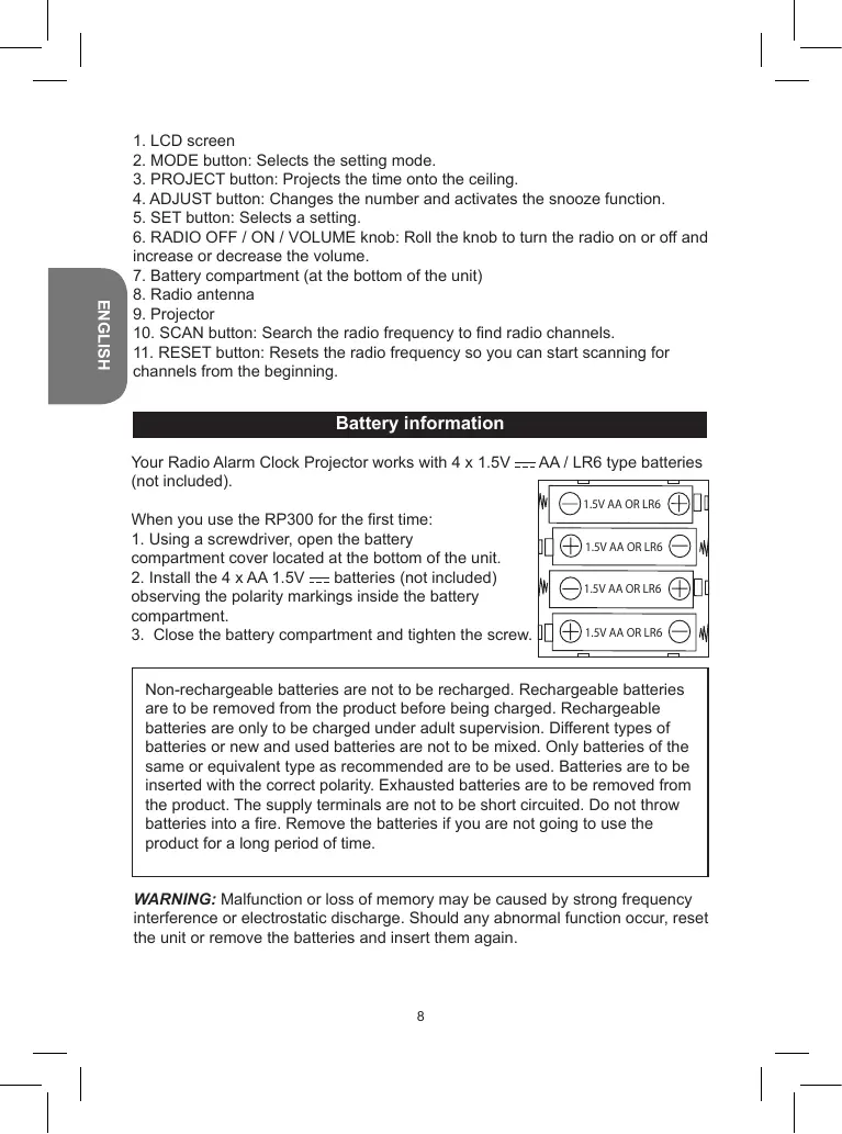 Your Radio Alarm Clock Projector works with 4 x 1.5V (not included). When you use the RP300 for the first time: 1. Using a screwdriver, open the battery compartment cover located at the bottom of the unit. 2. Install the 4 x AA 1.5V batteries (not included) observing the polarity markings inside the battery compartment. 3. Close the battery compartment and tighten the screw.