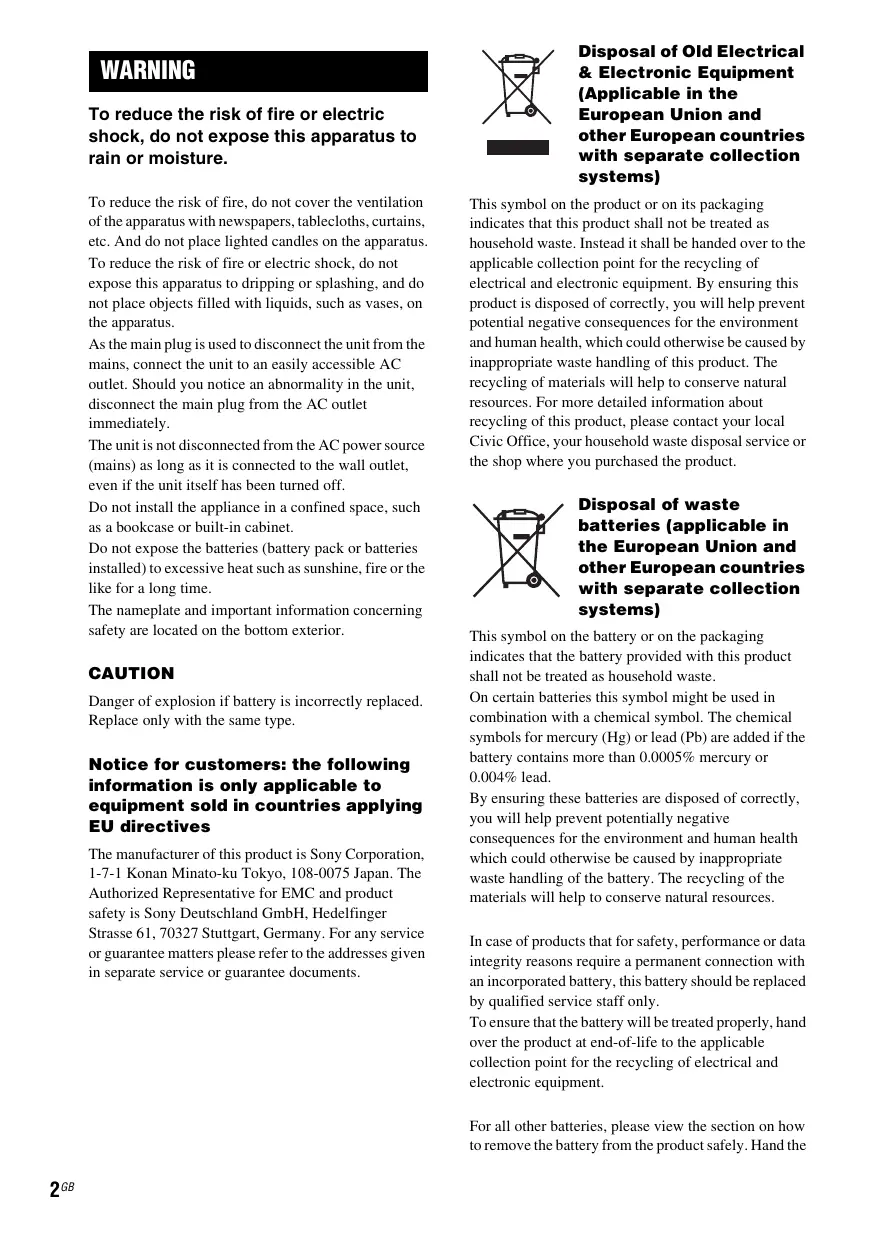 WARNING To reduce the risk of fire or electric shock, do not expose this apparatus to rain or moisture. To reduce the risk of fire, do not cover the ventilation of the apparatus with newspapers, tablecloths, curtains, etc. And do not place lighted candles on the apparatus. To reduce the risk of fire or electric shock, do not expose this apparatus to dripping or splashing, and do not place objects filled with liquids, such as vases, on the apparatus. As the main plug is used to disconnect the unit from the mains, connect the unit to an easily accessible AC outlet. Should you notice an abnormality in the unit, disconnect the main plug from the AC outlet immediately. The unit is not disconnected from the AC power source (mains) as long as it is connected to the wall outlet, even if the unit itself has been turned off. Do not install the appliance in a confined space, such as a bookcase or built-in cabinet. Do not expose the batteries (battery pack or batteries installed) to excessive heat such as sunshine, fire or the like for a long time. The nameplate and important information concerning safety are located on the bottom exterior. CAUTION Danger of explosion if battery is incorrectly replaced. Replace only with the same type. Notice for customers: the following information is only applicable to equipment sold in countries applying EU directives The manufacturer of this product is Sony Corporation, 1-7-1 Konan Minato-ku Tokyo, 108-0075 Japan. The Authorized Representative for EMC and product safety is Sony Deutschland GmbH, Hedelfinger Strasse 61, 70327 Stuttgart, Germany. For any service or guarantee matters please refer to the addresses given in separate service or guarantee documents. Disposal of Old Electrical & Electronic Equipment (Applicable in the European Union and other European countries with separate collection systems) This symbol on the product or on its packaging indicates that this product shall not be treated as household waste. Instead it shall be handed over to the applicable collection point for the recycling of electrical and electronic equipment. By ensuring this product is disposed of correctly, you will help prevent potential negative consequences for the environment and human health, which could otherwise be caused by inappropriate waste handling of this product. The recycling of materials will help to conserve natural resources. For more detailed information about recycling of this product, please contact your local Civic Office, your household waste disposal service or the shop where you purchased the product. Disposal of waste batteries (applicable in the European Union and other European countries with separate collection systems) This symbol on the battery or on the packaging indicates that the battery provided with this product shall not be treated as household waste. On certain batteries this symbol might be used in combination with a chemical symbol. The chemical symbols for mercury (Hg) or lead (Pb) are added if the battery contains more than 0.0005% mercury or 0.004% lead. By ensuring these batteries are disposed of correctly, you will help prevent potentially negative consequences for the environment and human health which could otherwise be caused by inappropriate waste handling of the battery. The recycling of the materials will help to conserve natural resources. In case of products that for safety, performance or data integrity reasons require a permanent connection with an incorporated battery, this battery should be replaced by qualified service staff only. To ensure that the battery will be treated properly, hand over the product at end-of-life to the applicable collection point for the recycling of electrical and electronic equipment. For all other batteries, please view the section on how to remove the battery from the product safely. Hand the 2GB battery over to the applicable collection point for the recycling of waste batteries. For more detailed information about recycling of this product or battery, please contact your local Civic Office, your household waste disposal service or the shop where you purchased the product. If you have any questions or problems concerning your unit, please consult your nearest Sony dealer. Duplication, edition, or printing of a CD, TV programs, copyrighted materials such as pictures or publications, or any other materials except for your own recording or creation is limited to private or domestic use only. Unless you hold copyright or have permission of copyright holders for the materials to be duplicated, use of those materials beyond this limit may infringe the provisions of the copyright law and be subject to the copyright holders claim for damages. When using photo images with this clock radio, pay special attention not to infringe the provisions of the copyright law. Any unauthorized use or modification of there’s portrait may also infringe their rights. For some demonstrations, performances, or exhibits, photography may be forbidden. Notes on LCD screen